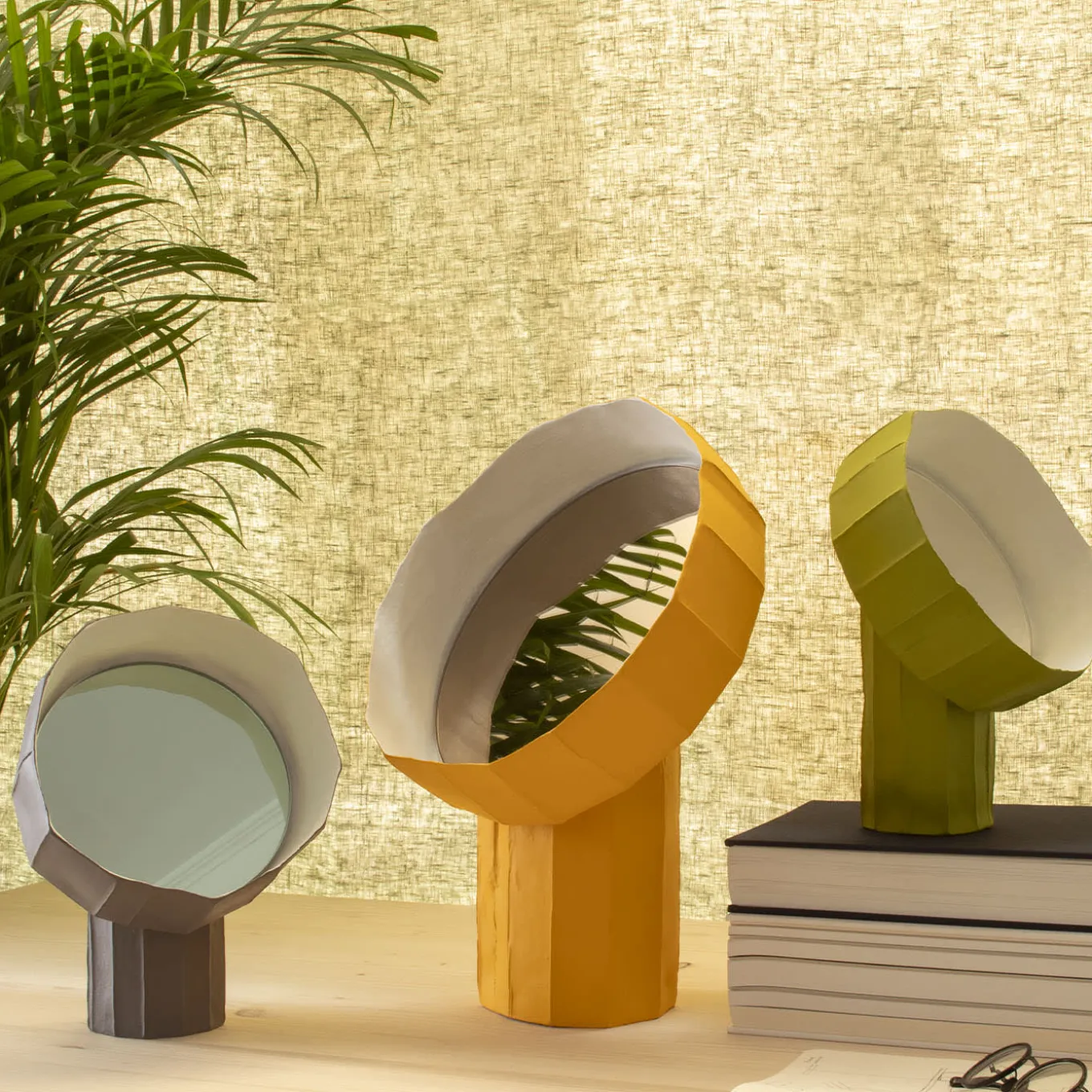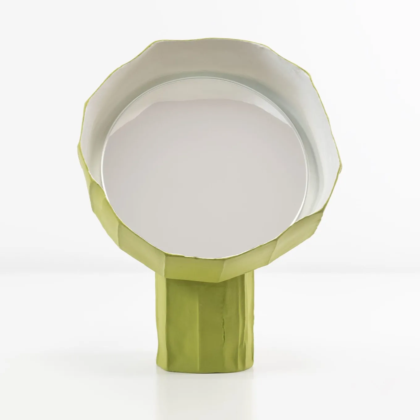 Sunflowers’ natural urge to follow the sun inspired Giovanni Botticelli and Paola Paronetto’s artful phytomorphic design of this table mirror. Fashioned of lime-green-hued paper clay, it flaunts a subtly faceted silhouette, including the corolla-like element where the mirrored glass is nestled. Please explore available color and size variants in the Artemest catalog.