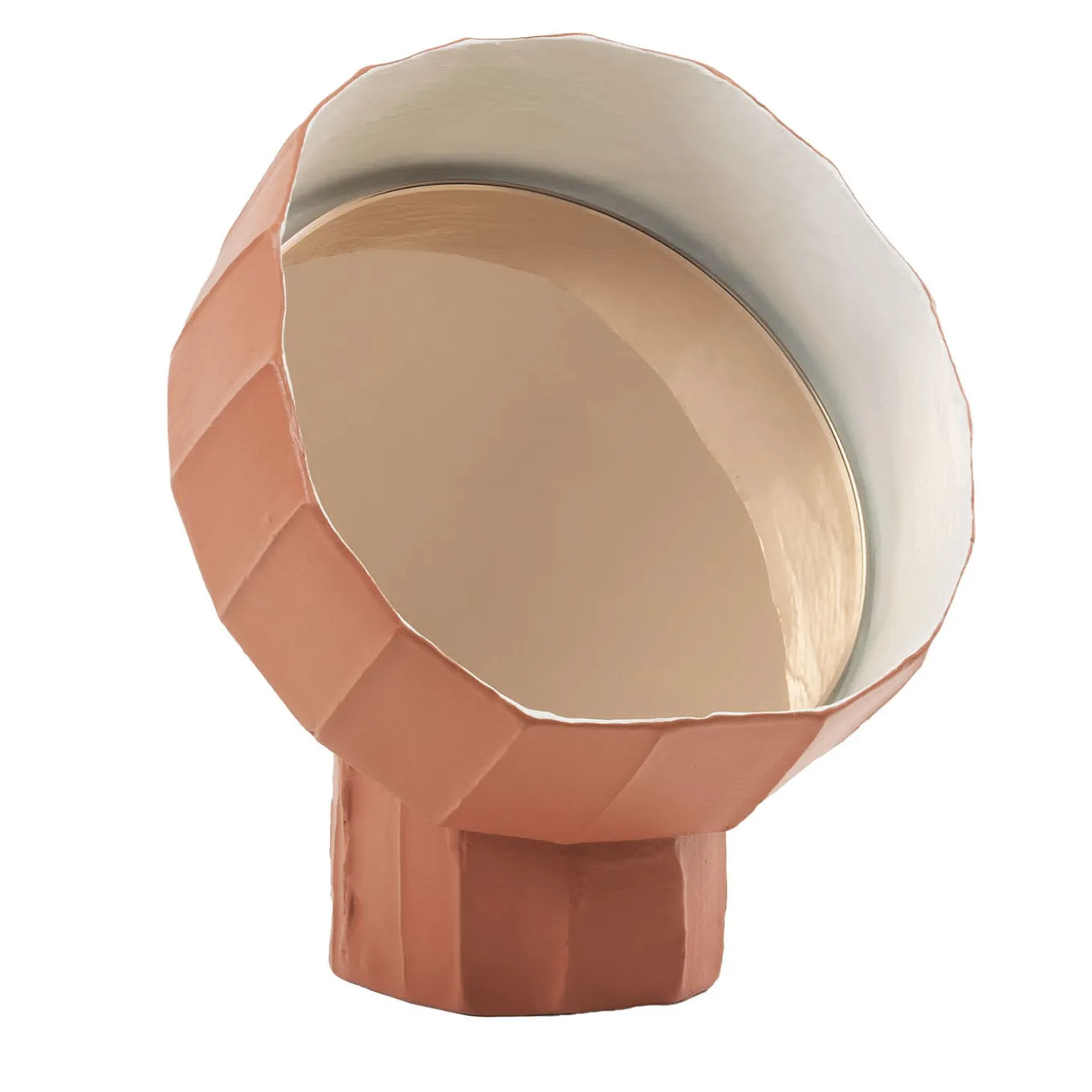 Inspired by sunflowers following the sun, this one-of-a-kind table mirror stands out for its sculptural and vaguely phytomorphic silhouette crafted from pink paper clay. Subtle irregularities further enhance the tactile dynamism already provided by its faceted texture that extends to the corolla-like element where the Golden mirrored glass is nestled. Different versions are available in the Artemest catalog.