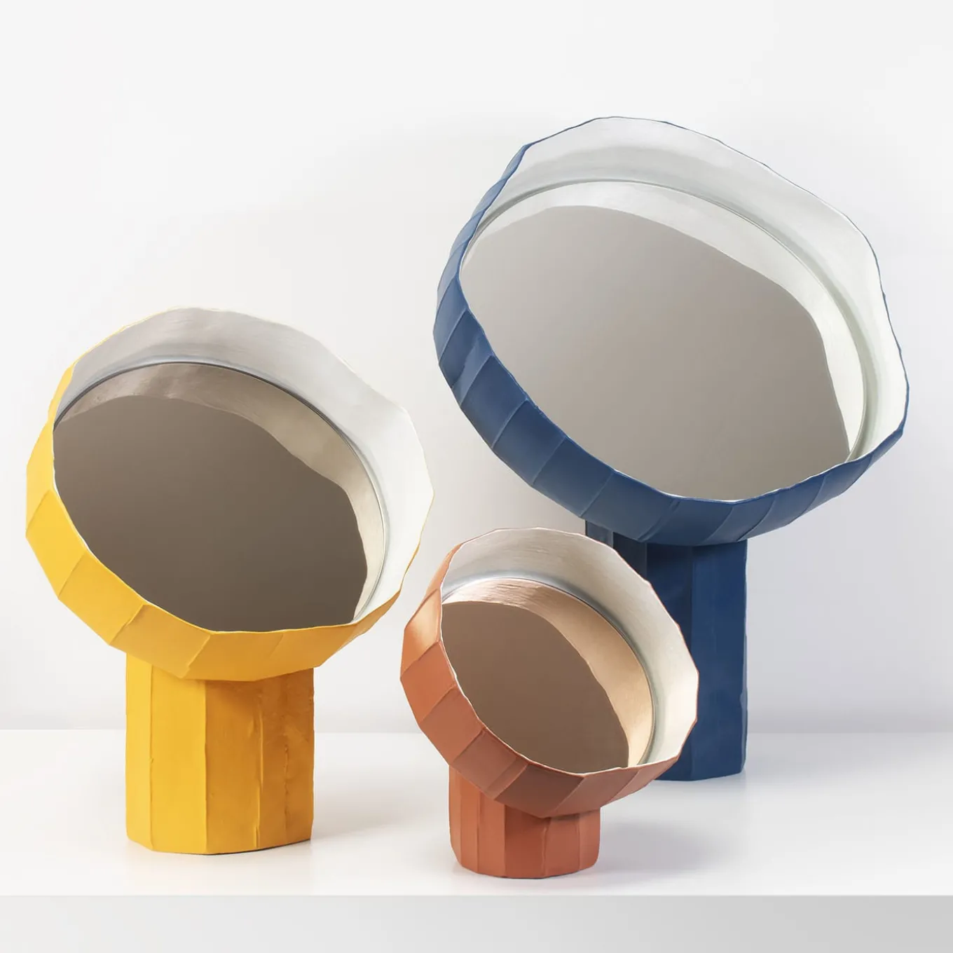 Unmistakably contemporary in its irregular profiles and original combination of materials, this table mirror was designed by Paola Paronetto and Giovanni Botticelli with sunflowers in mind. A subtly faceted texture marks the blue paper clay structure, which features a mirrored glass insert nestled in its corolla-like element. Sculptural and decorative, each piece is entirely unique.