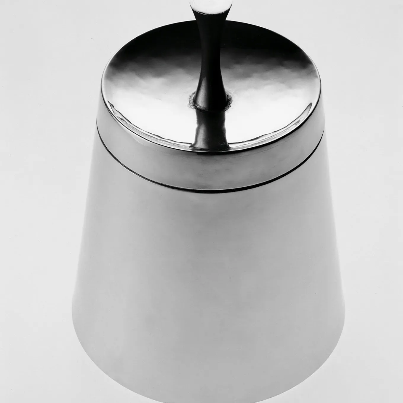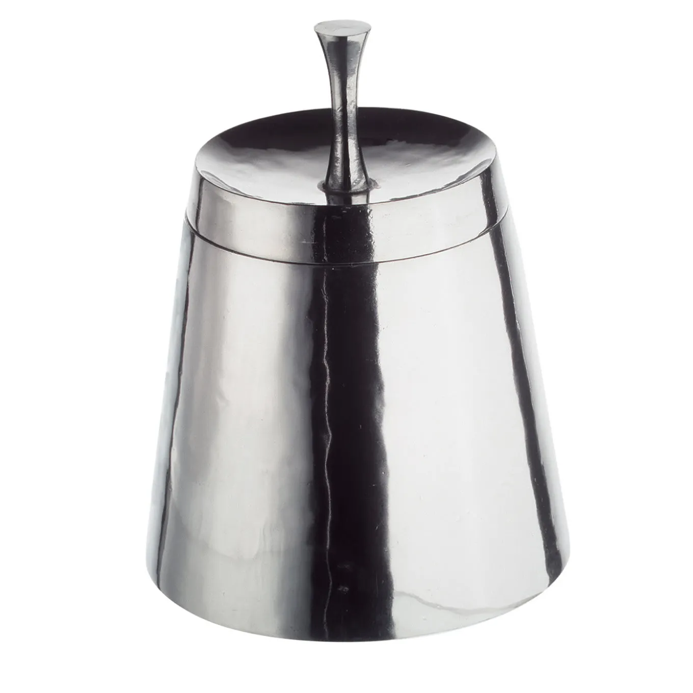 A sleek and refined design by Giovanni Levanti for the Metallia Project, this exquisite limited-edition box exudes contemporary sophistication with minimalist aesthetic. Crafted of pewter and boasting a polished finish, its conical silhouette is equipped with a lid and tall knob that can also function as a tray for small objects, such as earrings or rings.