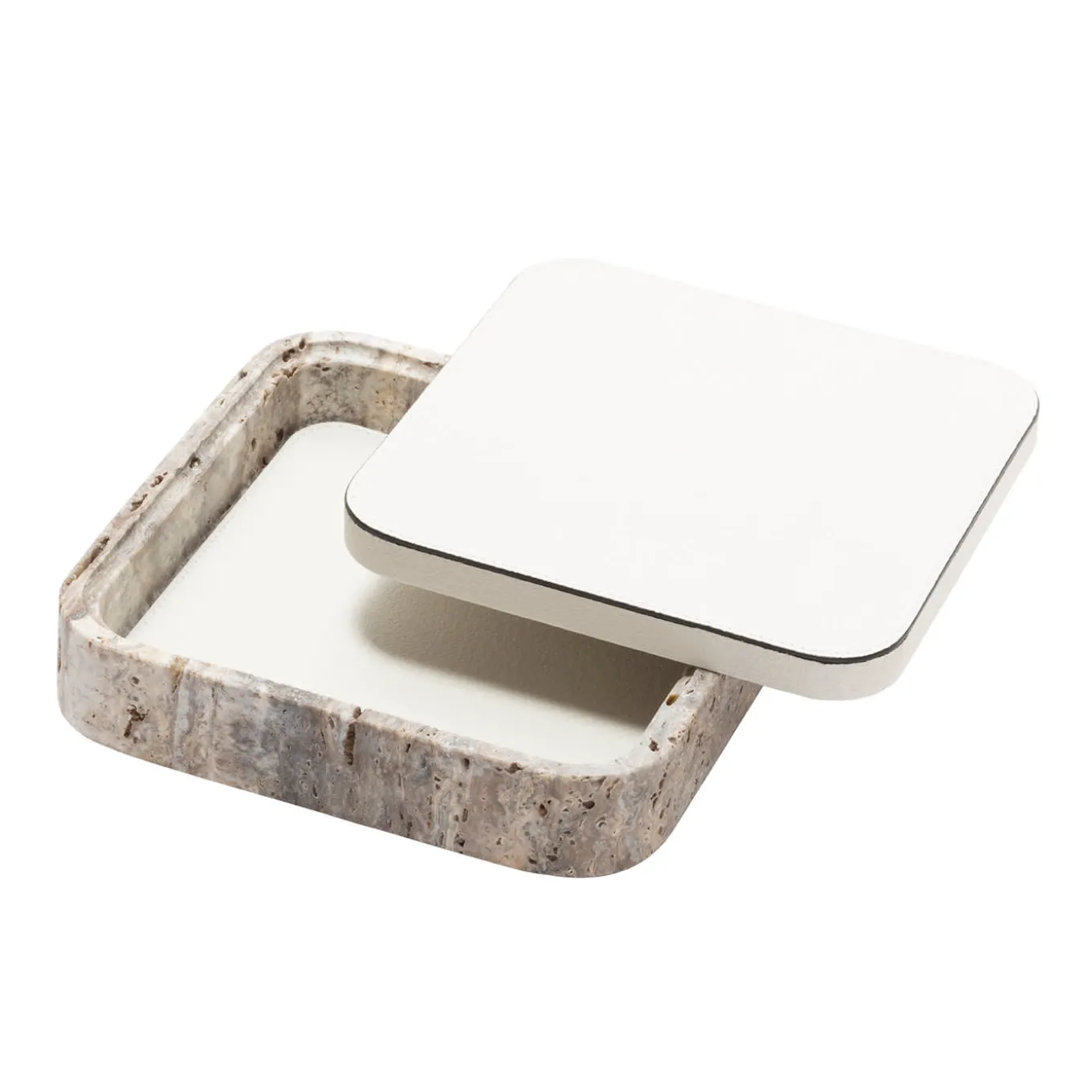 Featuring minimal geometric shapes, these boxes combine the beauty of travertine in several nuances of choice with the finest Italian leather. Custom sizes are available on request.