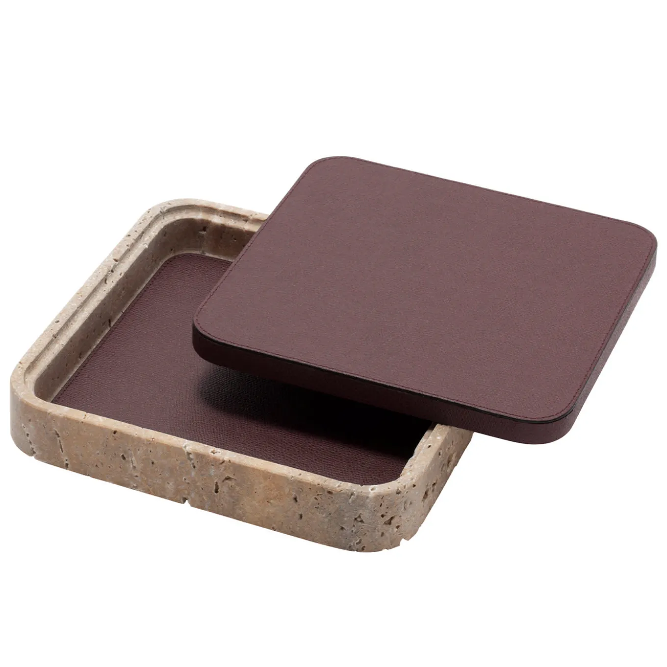 Featuring minimal geometric shapes, these boxes combine the beauty of travertine in several nuances of choice with the finest Italian leather. Custom sizes are available on request.