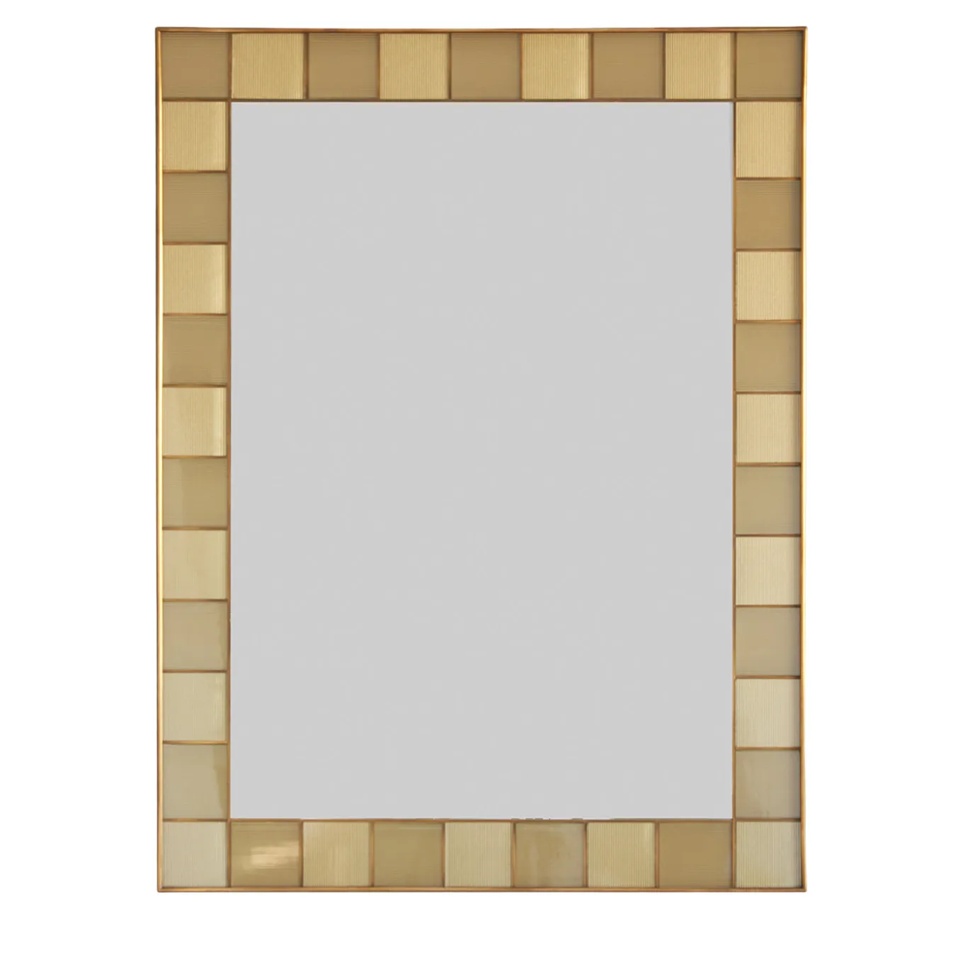 A rectangular wall mirror distinguished by a geometric frame composed of alternating satin brass and textured golden glass tiles, creating a dynamic visual rhythm. The interplay of smooth and wavy surfaces enhances light reflection and adds depth to the design. This piece offers a sophisticated blend of strict elegance and contemporary style, suitable for elevating various interior settings.