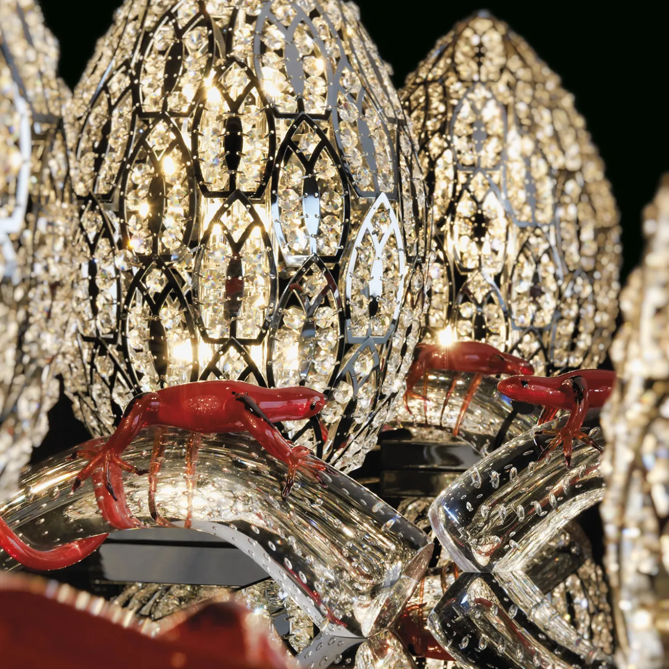 Masterfully handcrafted by expert artisans using traditional techniques of glassmaking, this figurine is a superb object of decor that will add an accent of lively color to a modern console, sideboard, or coffee table. The piece depicts a red gecko holding tight on a gray horn marked by a bubbly inner motif.