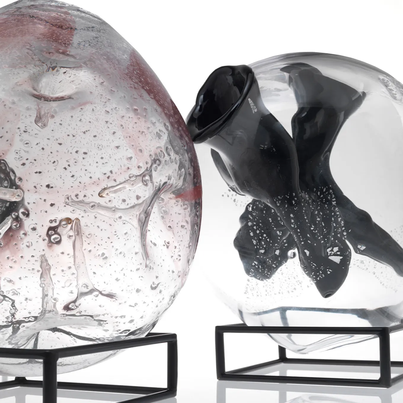 “Mouth-blown in the island of Murano, this unique glass piece is suspended in a simple metal wireframe base that completes the object in a balance of elementary forms and light. Glome X alludes to the very first moments of creation, the so-called cosmic inflation, a theory that describes how, in its earliest instants, the Universe expanded faster than light.” Vase in mouth-blown Murano glass with casting pink coloring and silver fragments. Metal base in glossy black finishing. No variations available.