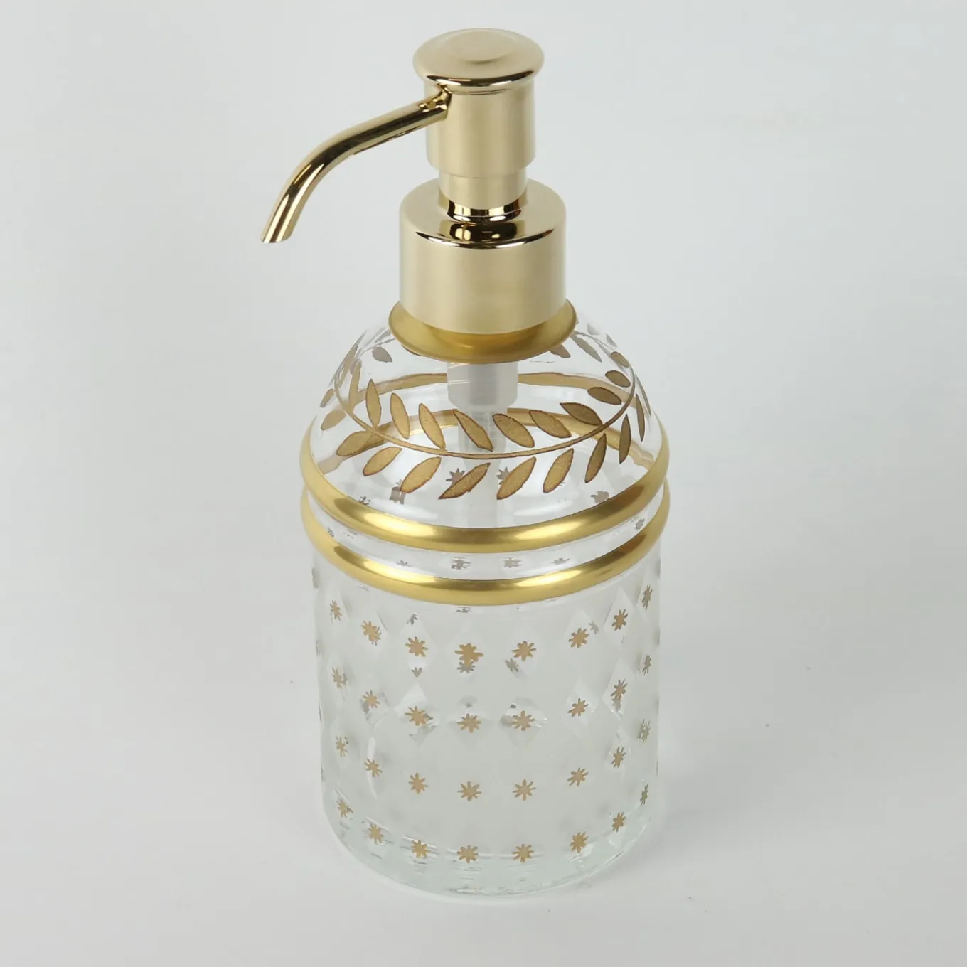 This soap dispenser from the Palazzo Collection showcases exceptional craftsmanship. Its robust blown glass structure features intricate diamond and star engravings with a laurel leaf motif. Adorned with 24k gold hand-painted details, the dispenser combines luxurious design with practicality. The refined detailing makes it a striking addition to contemporary and traditional bathroom interiors.