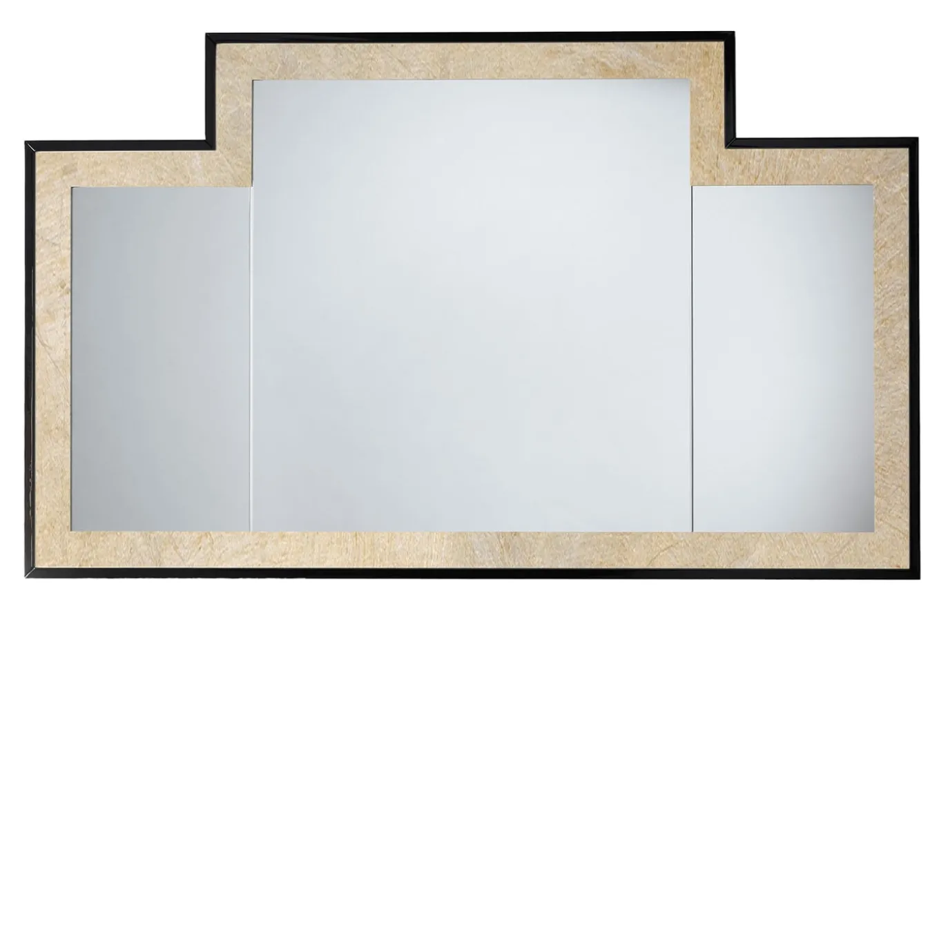 A refined variation of the sophisticated atmospheres of the forties American design for a large mirror characterized by rigorous geometric patterns and the decisive chromatic alternation between the black edge and the internal frame in antiqued aluminum leaf. Please, contact the Concierge service for further information.