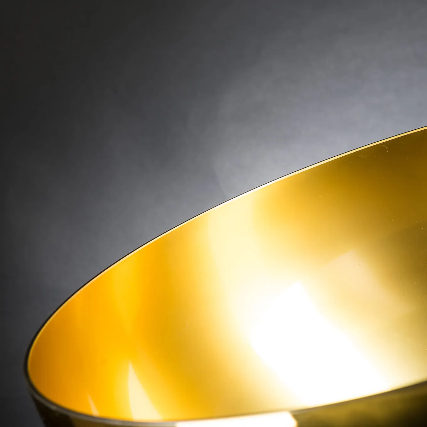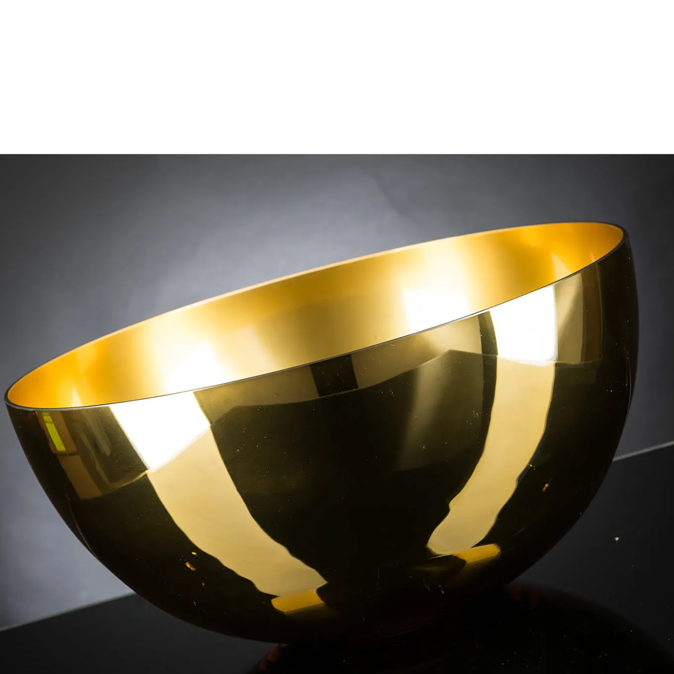 Boasting a singular and captivating quality marked by a glowing interplay of reflections, this exquisite bowl is masterfully handcrafted of gold-colored glass. It may be used as a centerpiece for an elegantly set dining table, or even as a statement piece on a modern coffee table.