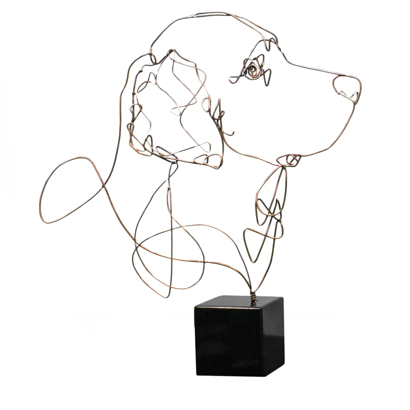 Portraying the calm and tender snout of a Golden Retriever, this stupendous statuette will be a superb personalized gift for an animal lover. Customizable with a portrait of one’s own dog, or any other dog breed, it is deftly handmade of bronze metal wire, supported with a polished black cube base. Other 69 dog breeds available, please contact the Concierge for more information and customization options.
