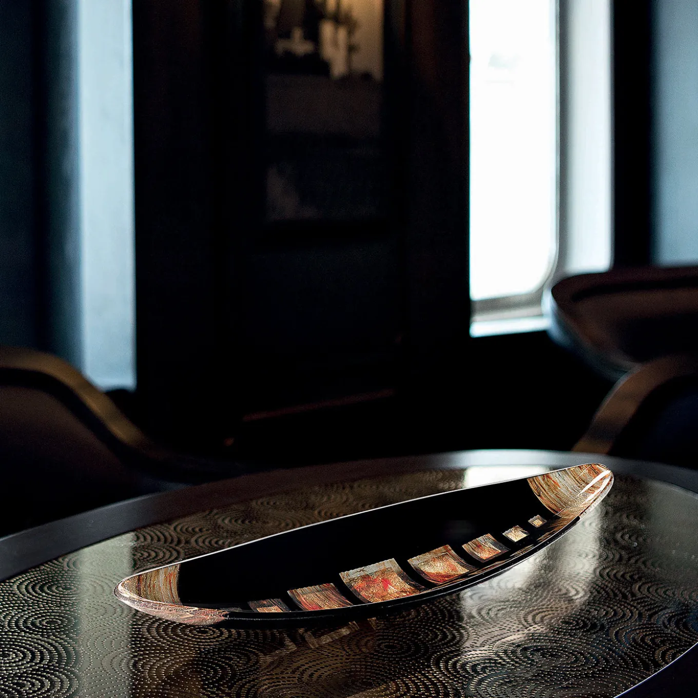 Elegant murano glass centerpiece shaped like a gondola, featuring a base of black glass canes and aventurine glass inlays on a silver leaf background. The piece draws inspiration from the traditional venetian boat used in special rowing events, known for its size and the twelve rowers required to navigate it. Dimensions may vary slightly due to the handcrafted nature of the item.