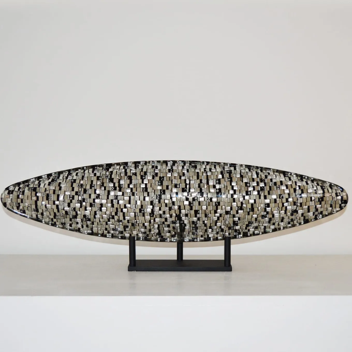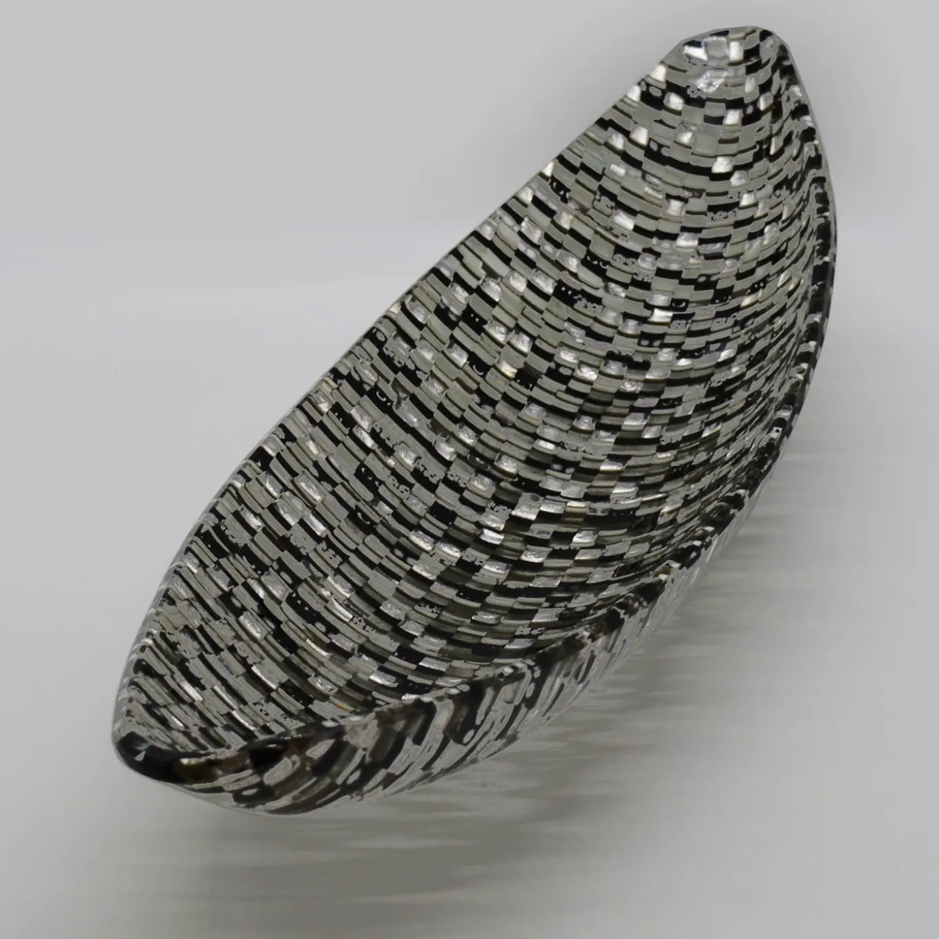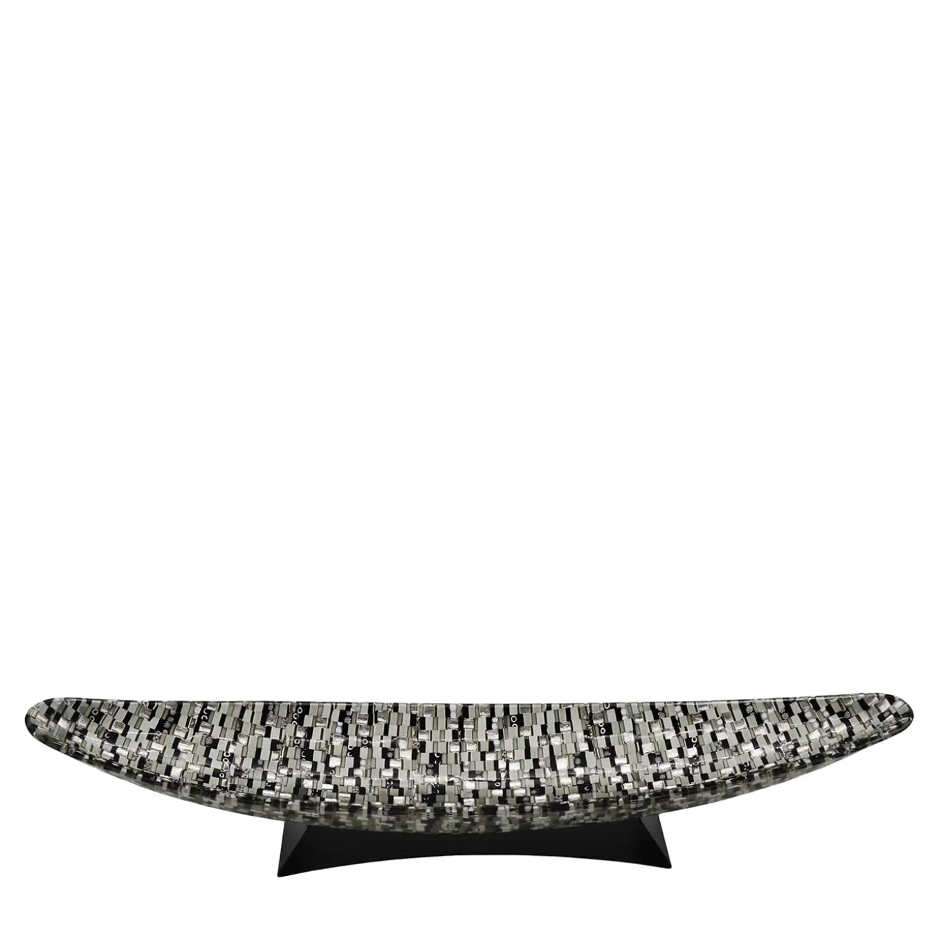 Shaped like a “gondola” – the iconic mode of transport for exploring the Venetian canals – this centerpiece bowl is a gem of glassmaking artistry. A triumph of gray, white, and black Murano glass tiles are minutely hand-assembled before being enriched with precious specks of gold and silver leaf. Its majestic size makes it an ideal complement to refined contract, private, or hospitality contexts, alike.