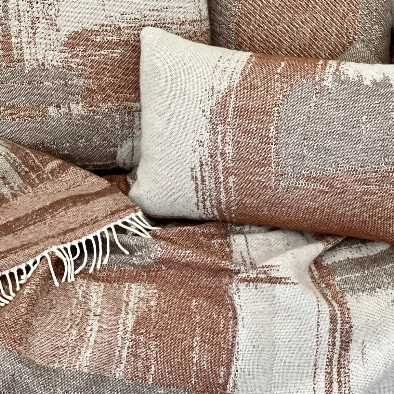 This elegant artisan blanket, hand-woven by Como artisans using a blend of 80% Merino wool and 20% cashmere sports a captivating, irregular pattern seemingly recreating brushstrokes. The clever selection of earthy tones for its weft favors its addition to a wide variety of palettes and styles. Completed by a fringe. Dry cleaning is highly recommended.