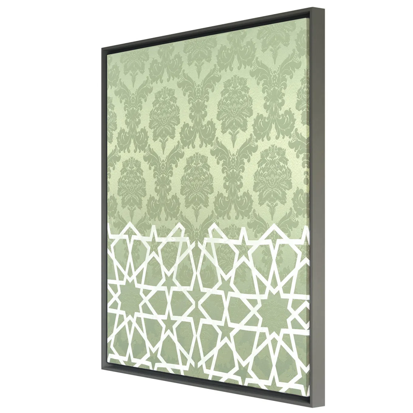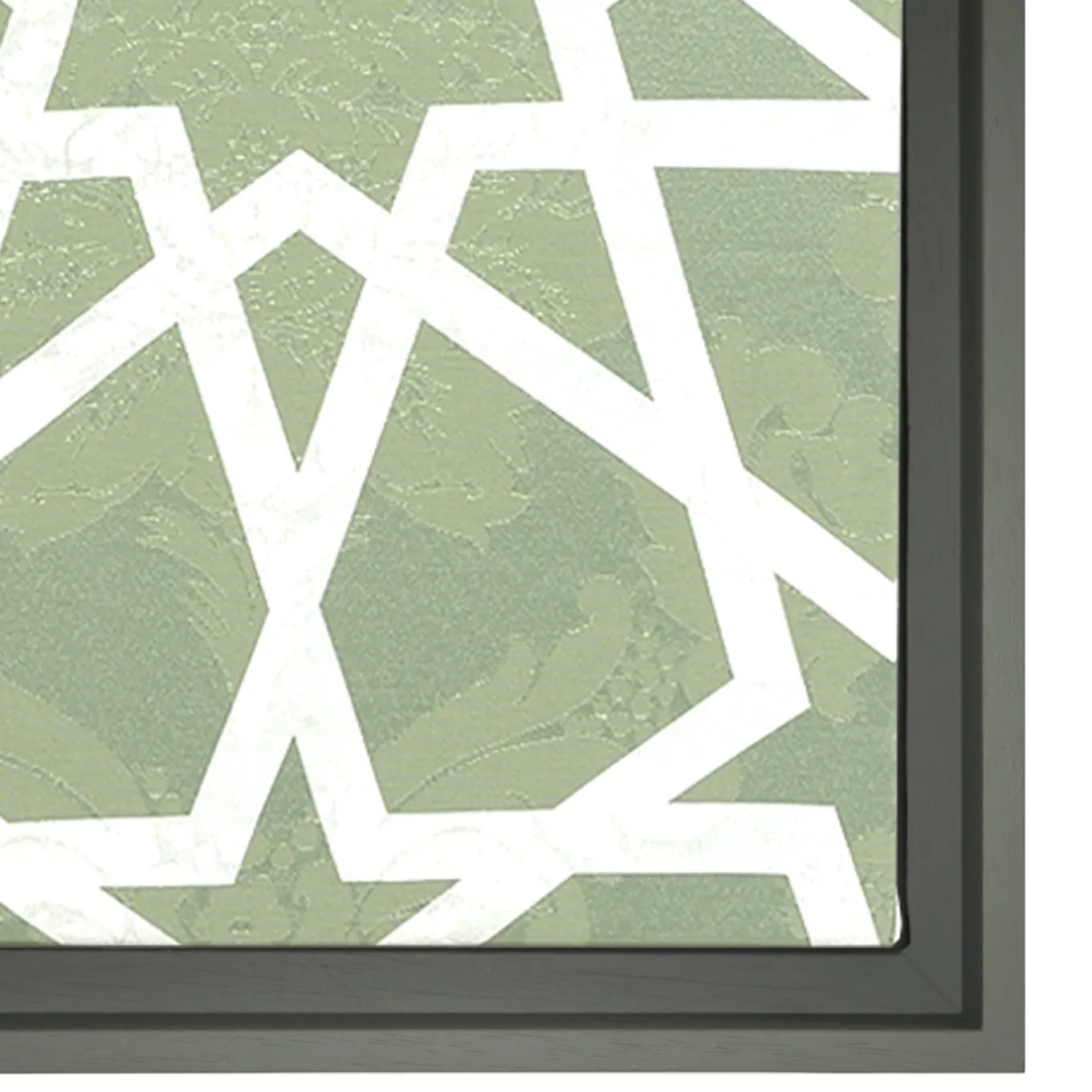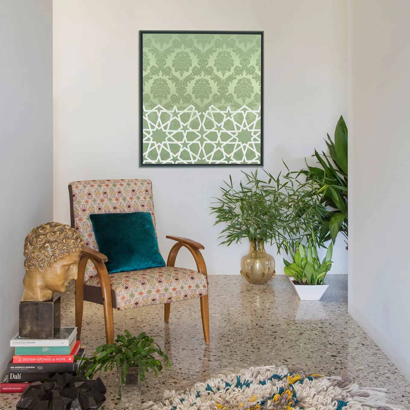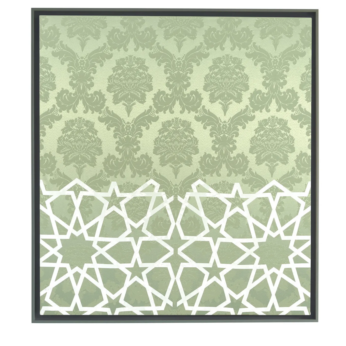 An impeccable piece of decor by Amelia Corvino, this panel is fashioned of a refined mint green damask coming from the most prestigious Venetian weaver’s shops. Internally filled with fine cotton fabric, a wooden frame is available upon request. Reminiscent of the superb melodic combination known in music as a counterpoint (“contrappunto” in Italian), this piece functions as an artistic bridge between the East and the West, combining the typical damask pattern on its top part with an Islamic geometric motif on the bottom.