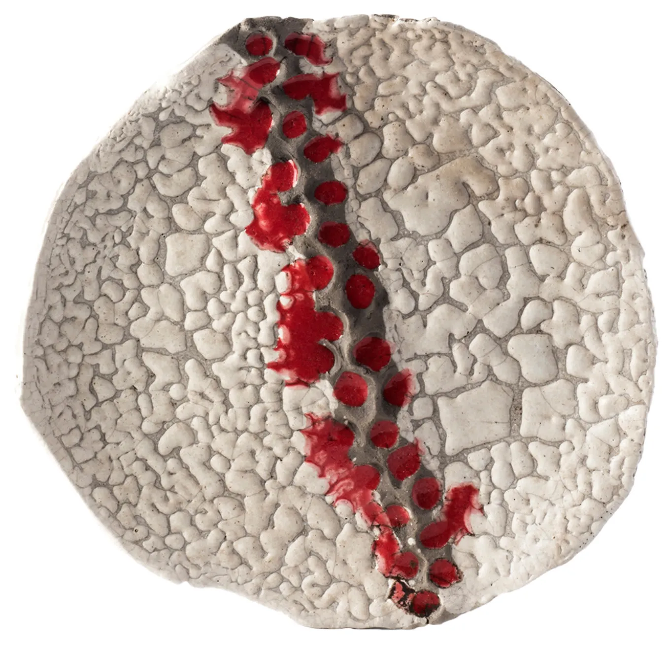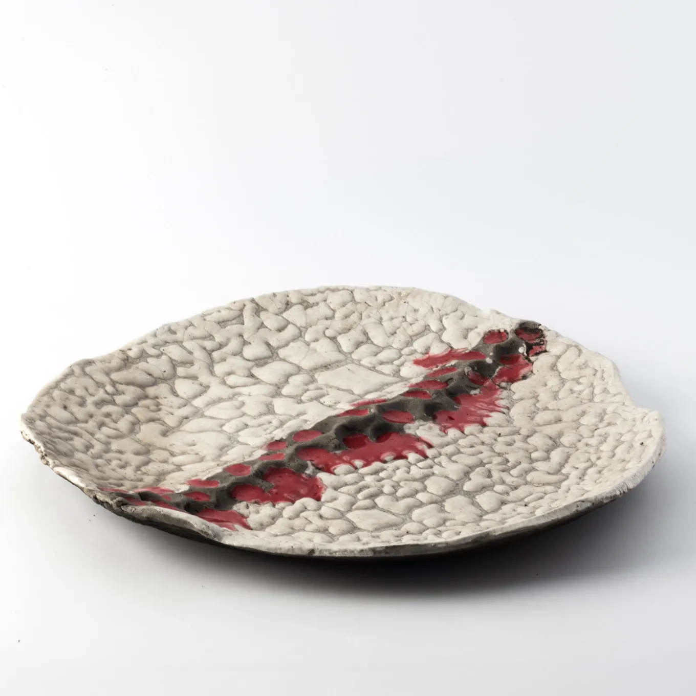 This exclusive decorative plate by Nino Basso will make a statement in a contemporary interior, either as a table centerpiece or a wall sculpture. Handcrafted of ceramic using the Raku technique, irregular streaks of red and black enamel stretch across the textured white-gray surface of this one-off plate suggestive of the moon surface. A wonderful gift for a collector or contemporary art enthusiast, this plate comes in a special packaging with a care instruction leaflet.