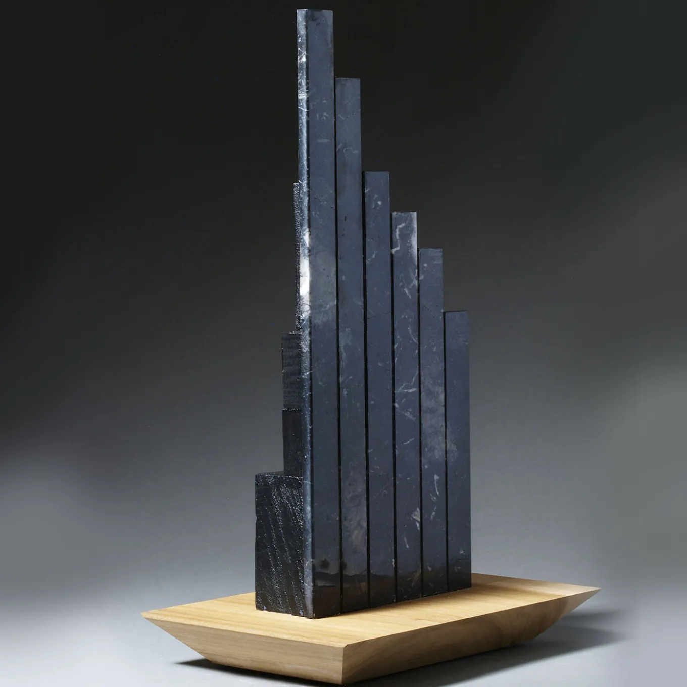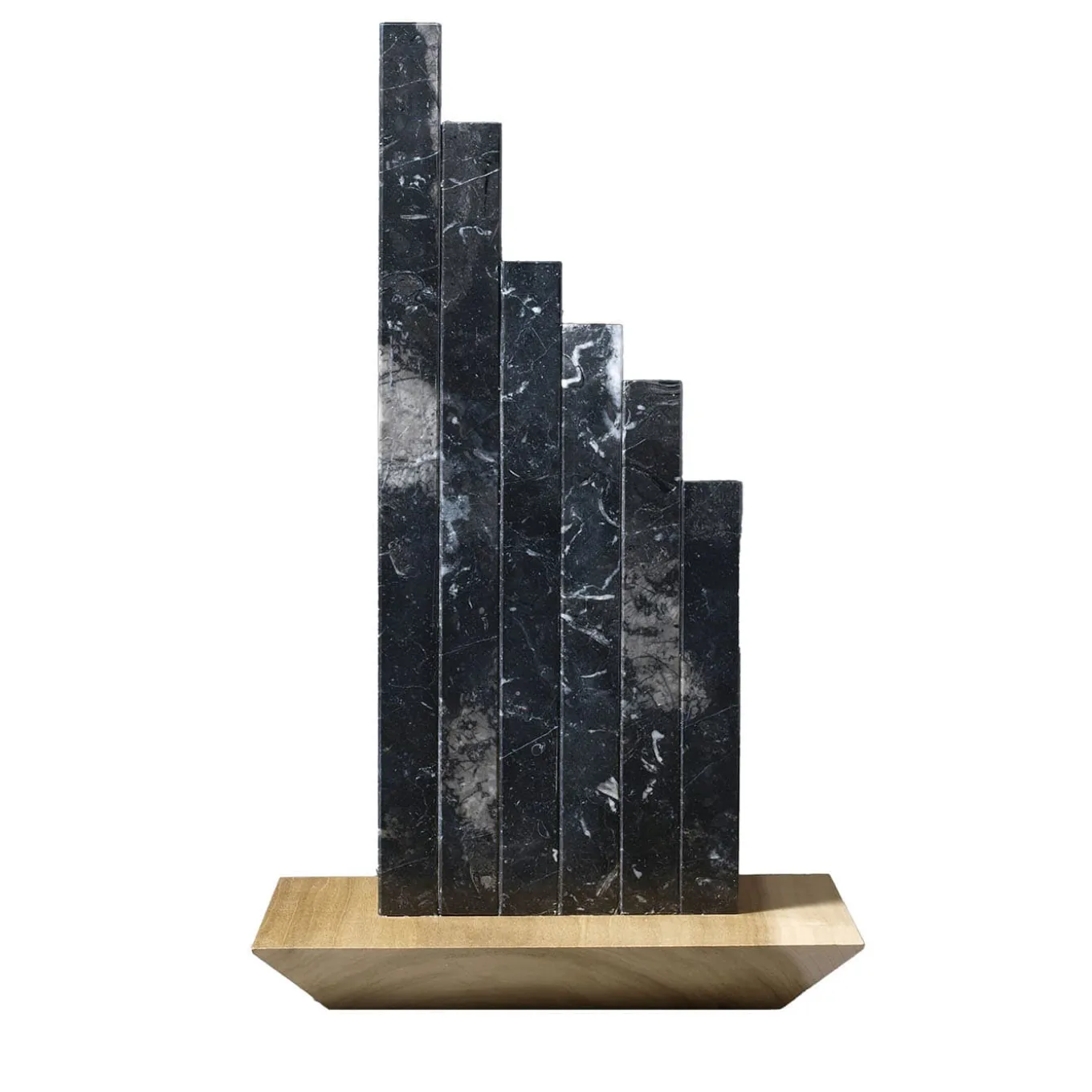 This majestic sculpture, named after the Italian ‘Grattacielo nero’, is an exceptional expression of Ennio Nonni’s artistic theme of the ‘Vertical City’. Reminiscent of ziggurat profiles and resting on a hardwood base, its rigorous and dramatically stylised silhouette is composed of thin slabs of black marble attached to matching wooden elements.