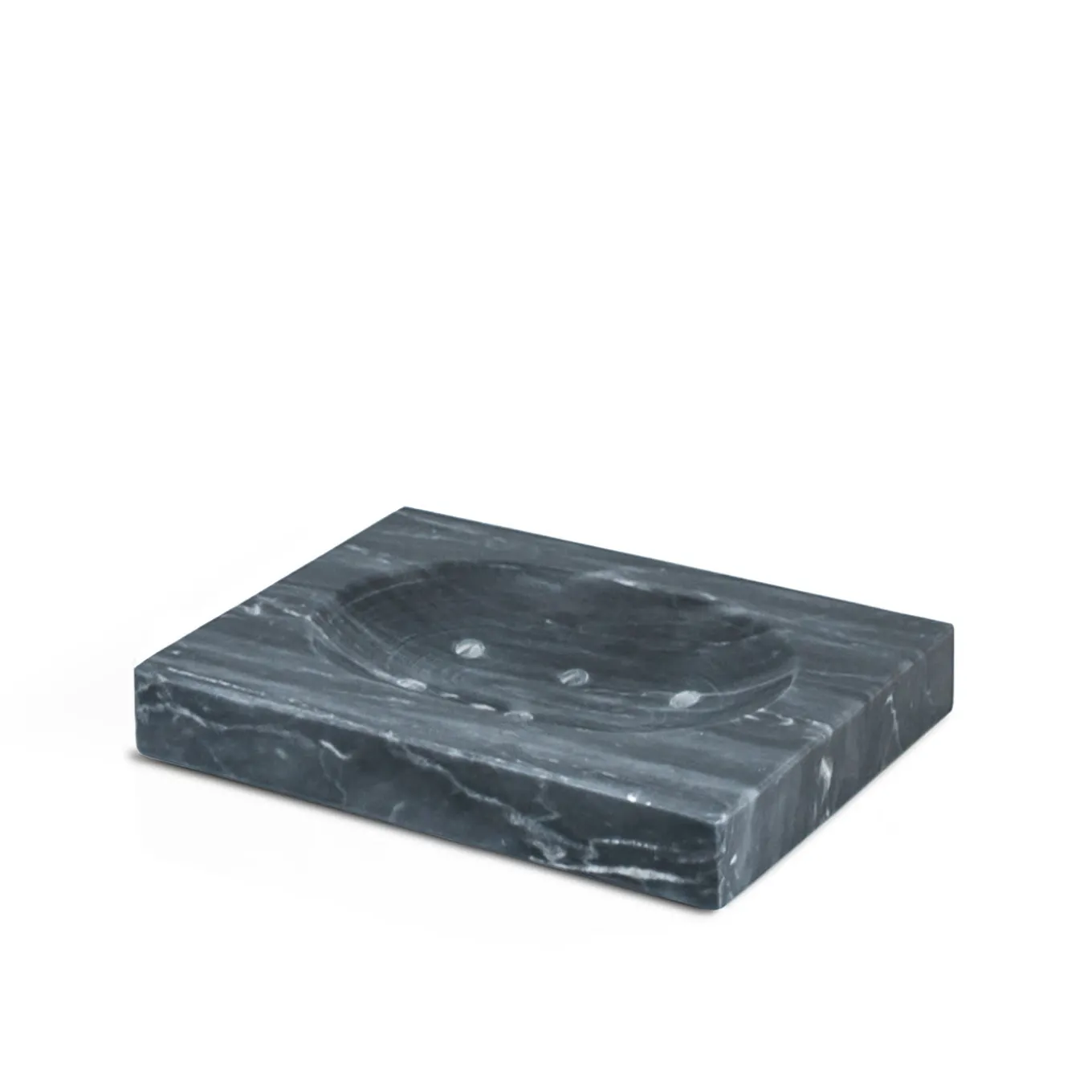 This bathroom set handcrafted of gray Bardiglio marble is a stunning and elegant addition to any contemporary bathroom. It features a bar soap holder (10x13x H 2cm), a liquid soap dispenser (9x9x H 19cm), a toothbrush holder (8.5×8.5xH 12.5cm), and a box with lid (9.5×9.5×9.5cm). The alluring aesthetic of the natural stone acquires always new veining in each piece making every object truly unrepeatable. The set is not dishwasher safe.