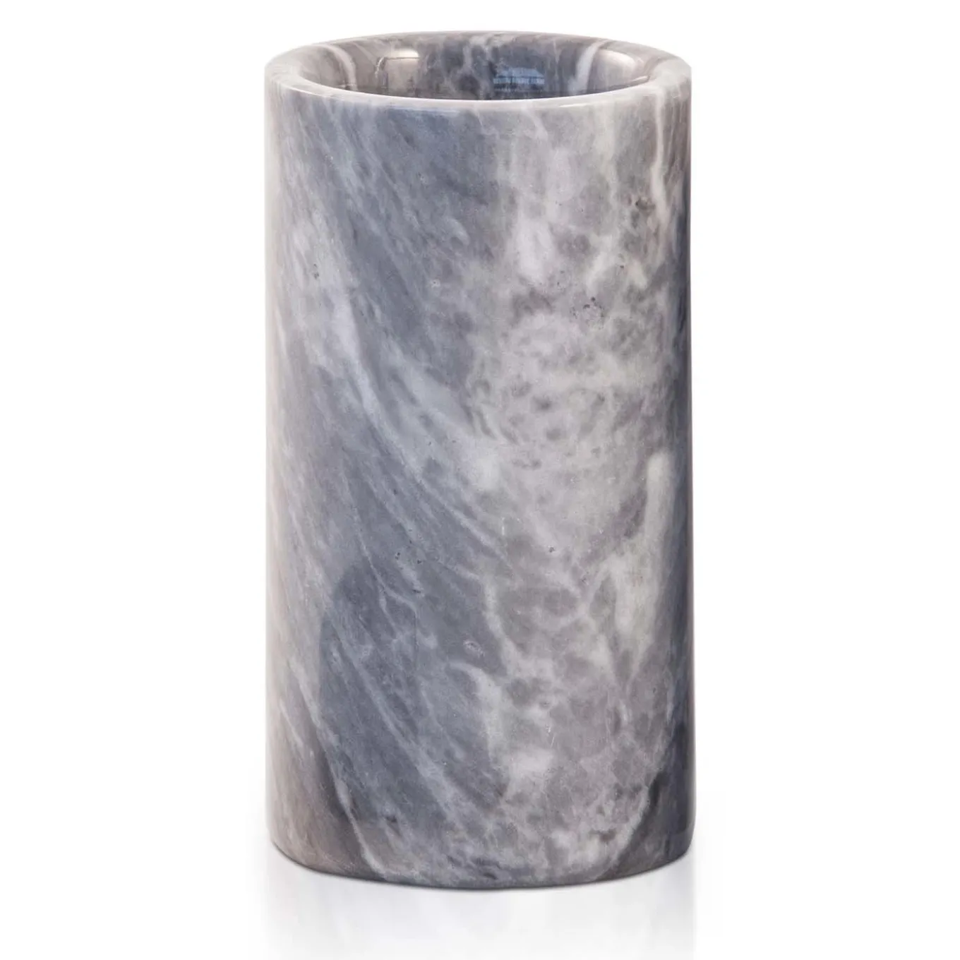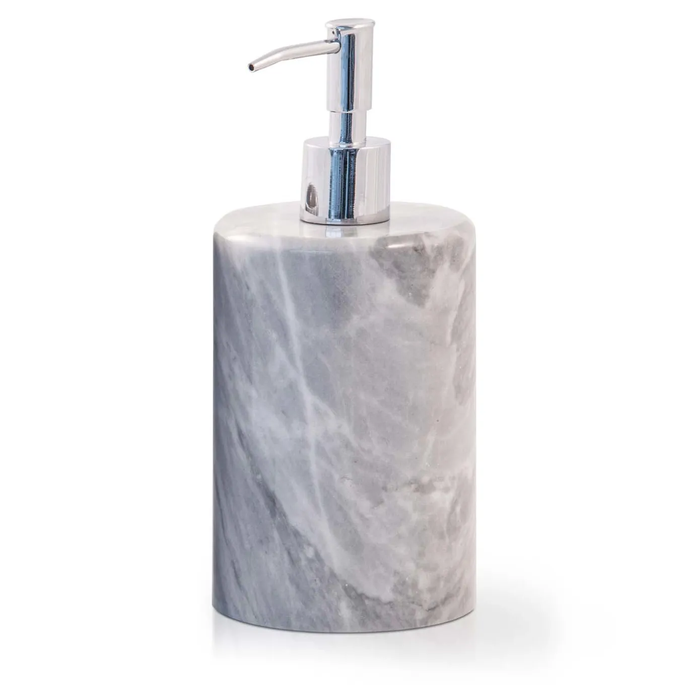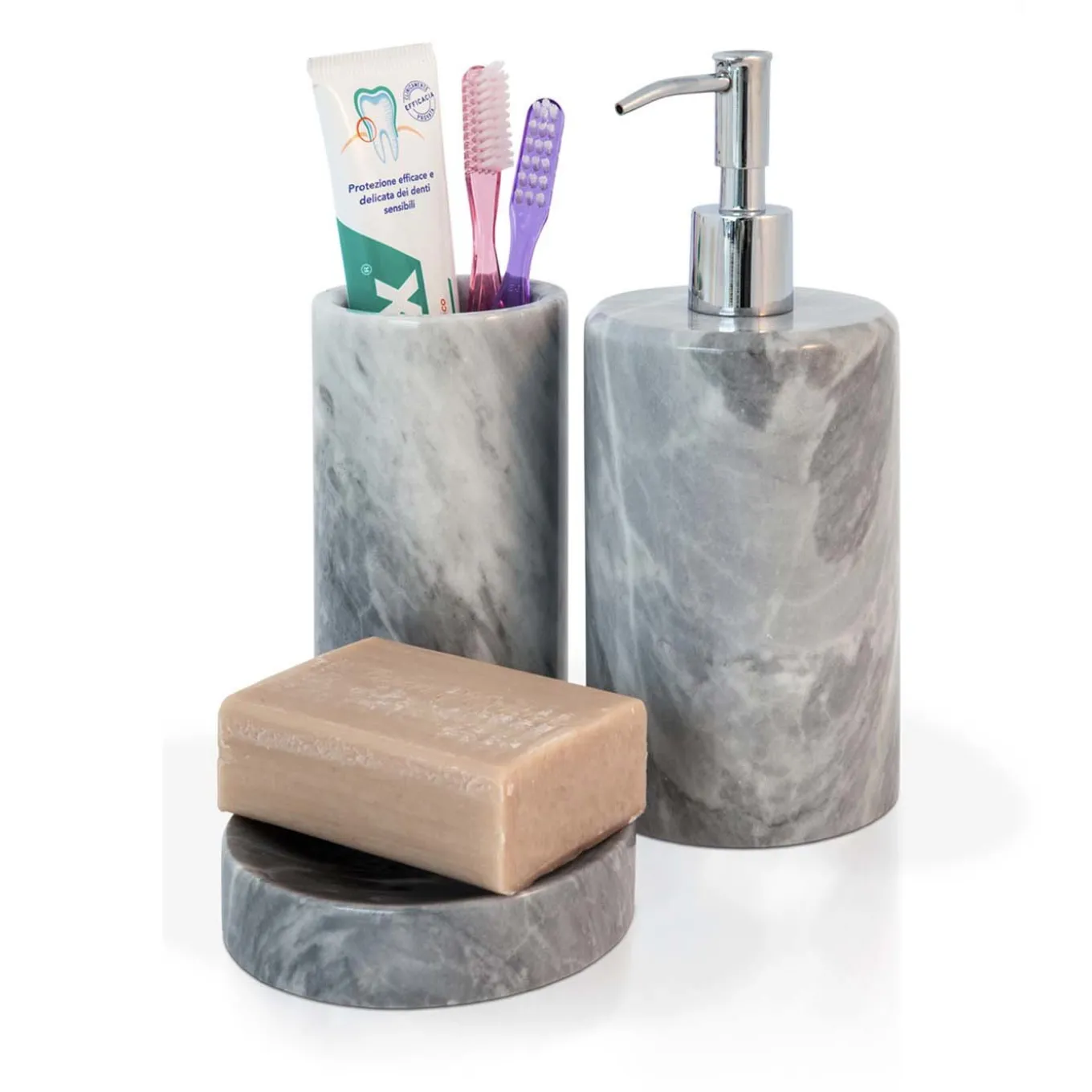 Ideal for a sophisticated home with an industrial or contemporary decor, this set is a precious addition to a bathroom, where it can be combined with other items by Fiammetta V, creating a cohesive look. The set was crafted entirely of grey marble and includes: a soap dish (10 cm in diameter and 2 cm in height), a toothbrush holder (7 cm in diameter and 12 cm in height), and a soap dispenser with metal pump (9 cm in diameter and 19.5 cm in height).