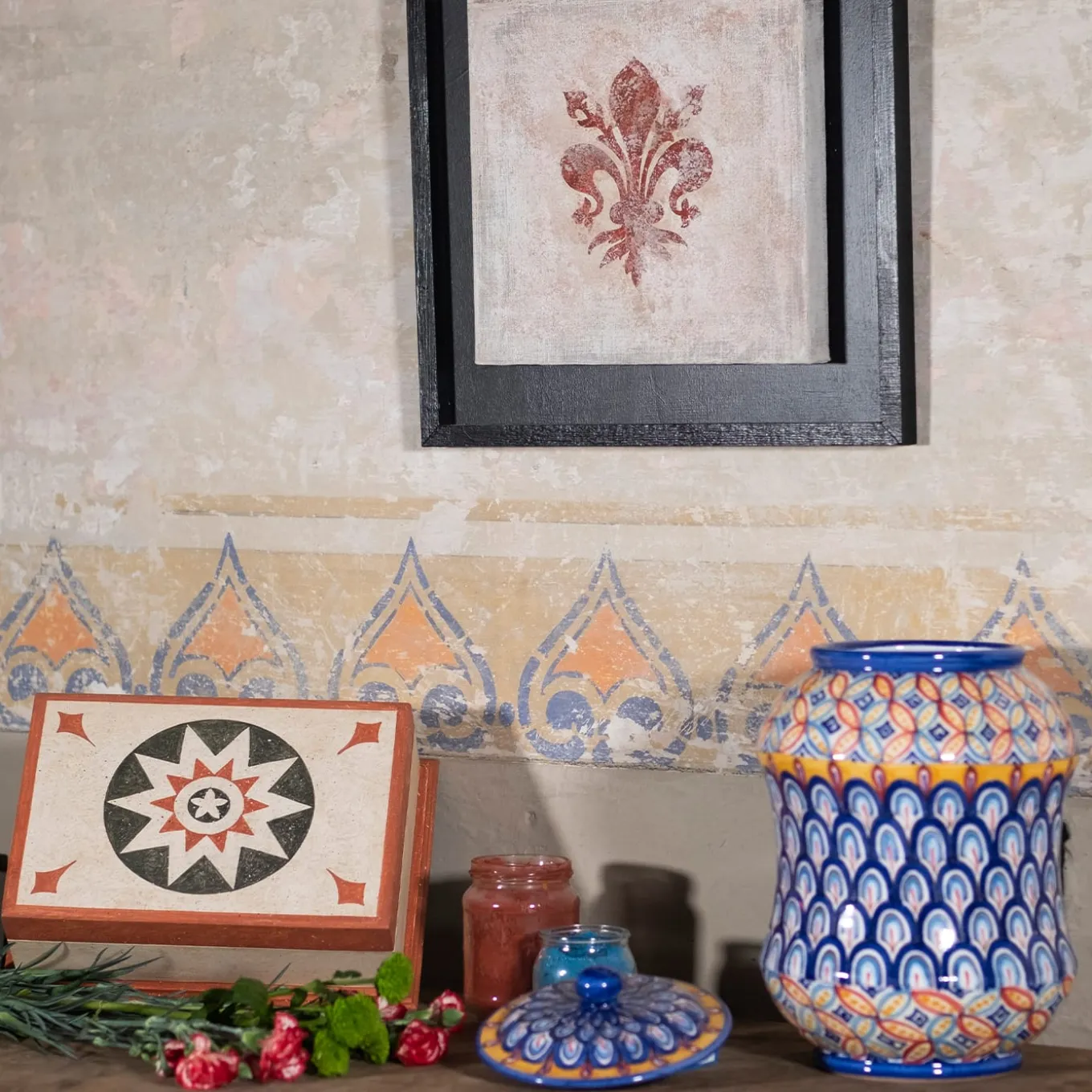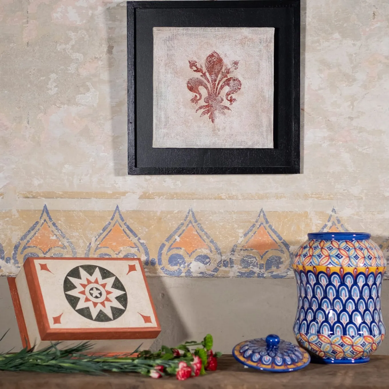 Decorative and functional, this box showcases traditional craftsmanship that will stand out in a classic decor. The rectangular box is fashioned of repurposed wood hand-painted in a white acrylic tempera, the marbled texture achieved with a sponging technique in the “encausto veneziano” style, found on Renaissance church fa√ßades. The lid boasts a green and white eight-pointed star in a red circle with green fleur de lis in the corners. The green beveled pedestal complements the lid’s green edge for a simple finishing touch. Beeswax coating adds a glossy and protective finish.