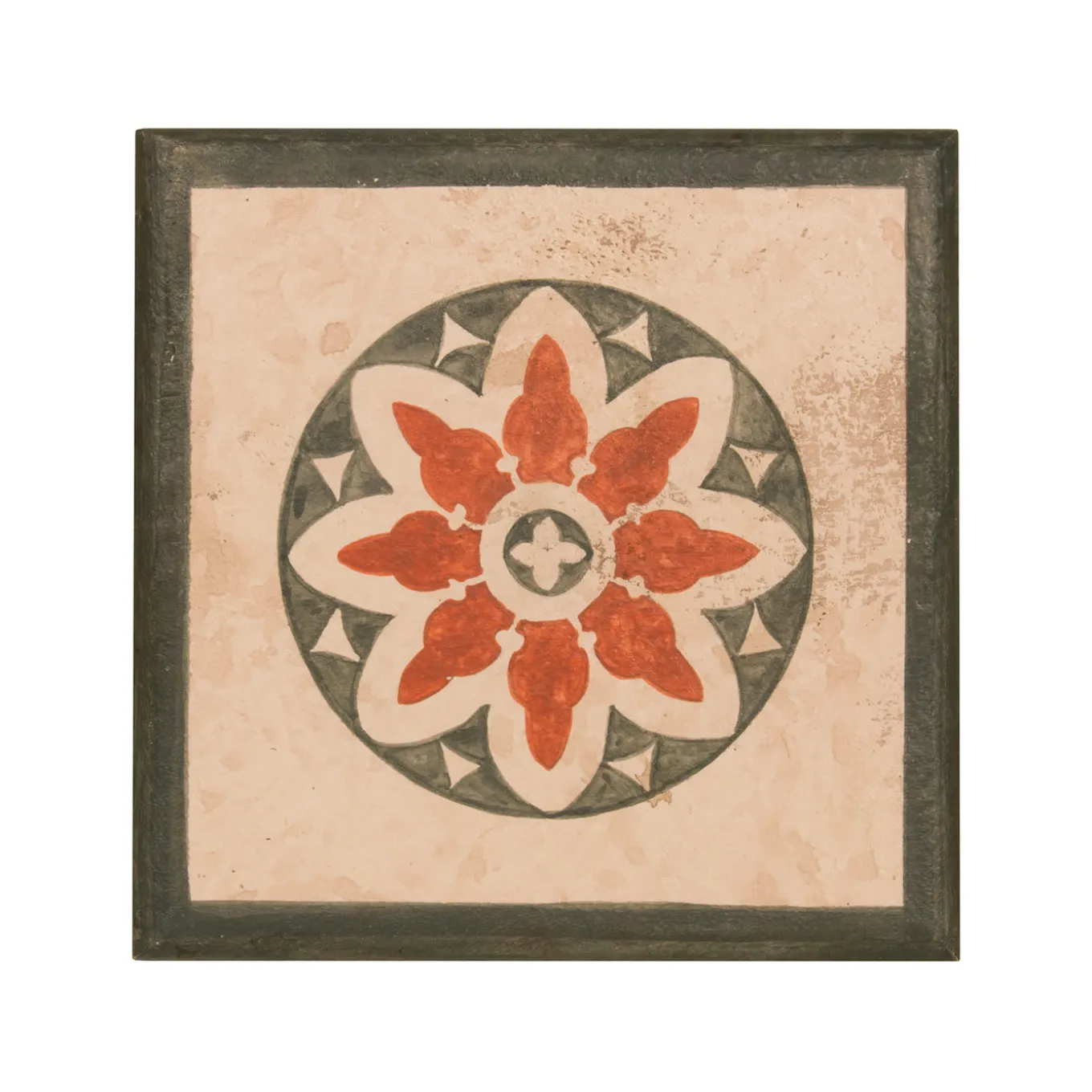 Used to store jewelry on a bedroom dresser, keepsakes on a living room coffee table, or stationary on an office desk, this elegant box will add glamour and function to any room. Fashioned of repurposed wood using traditional crafting techniques, the square silhouette is hand-painted in a white acrylic tempera with a marbled texture in the “encausto veneziano” style. The lid has a stylized flower motif with red petals framed by a green circle and a matching green edge. It is painted with natural pigments and finished with a protective beeswax coating.