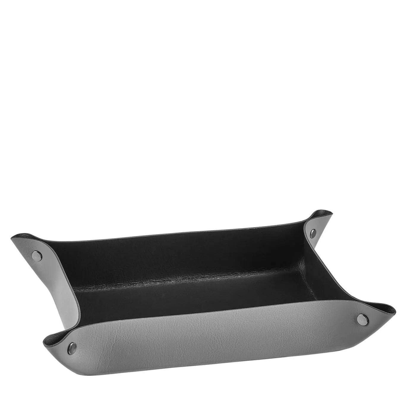 A practical vide poche designed to keep small desk items such as paper clips, coins, and keys organized and easily accessible. Featuring a sleek rectangular shape with raised corners secured by snaps, it offers a modern aesthetic in grey and black tones. Created by designer Ekaterina Borovkova, this piece adds a refined yet functional element to any workspace or tabletop.