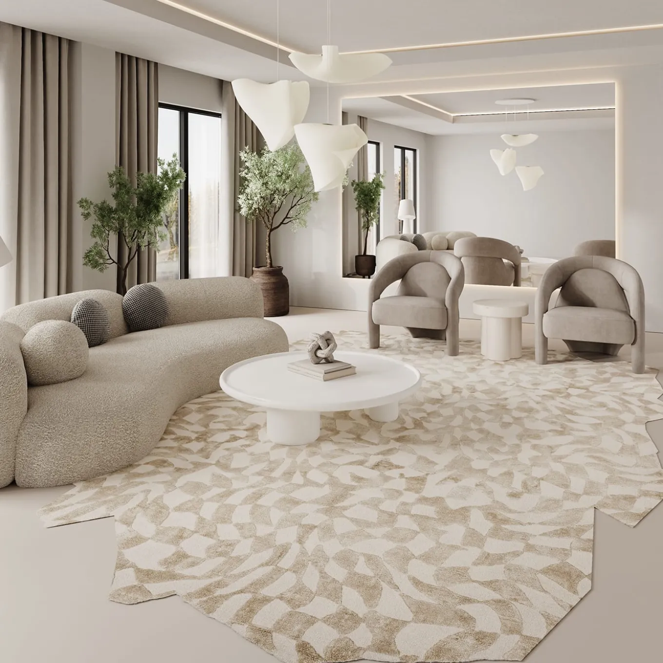 A new addition to the Design Collection, the Groove rug features an abstract, irregular shape. Its geometric pattern in beige and natural white creates a striking contrast, enhanced by the luminosity of fine silk. Hand-knotted in Nepal, it is crafted from 50% silk and 50% fine Himalayan wool, dyed with natural pigments. With a 5 mm base, 7 mm pattern, and 152,000 knots/m². Fully customizable, with optional stain-resistant treatment. Contact the Concierge for details.
