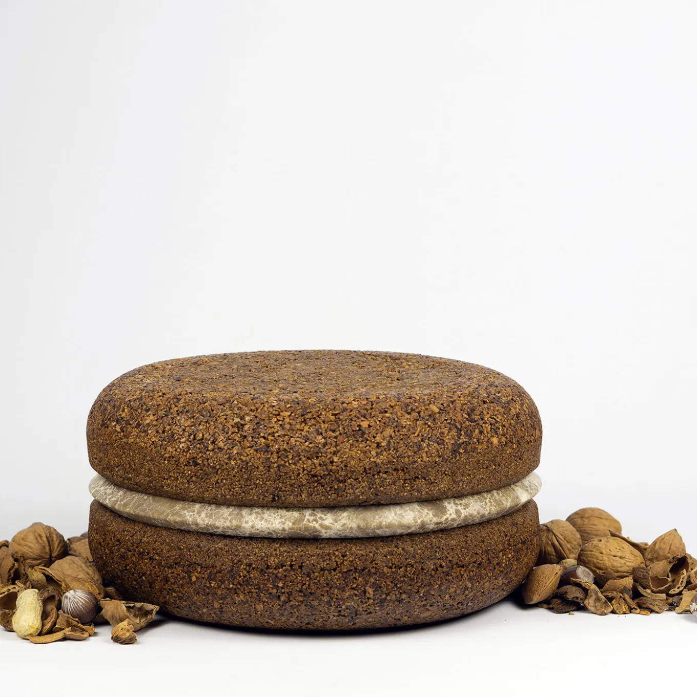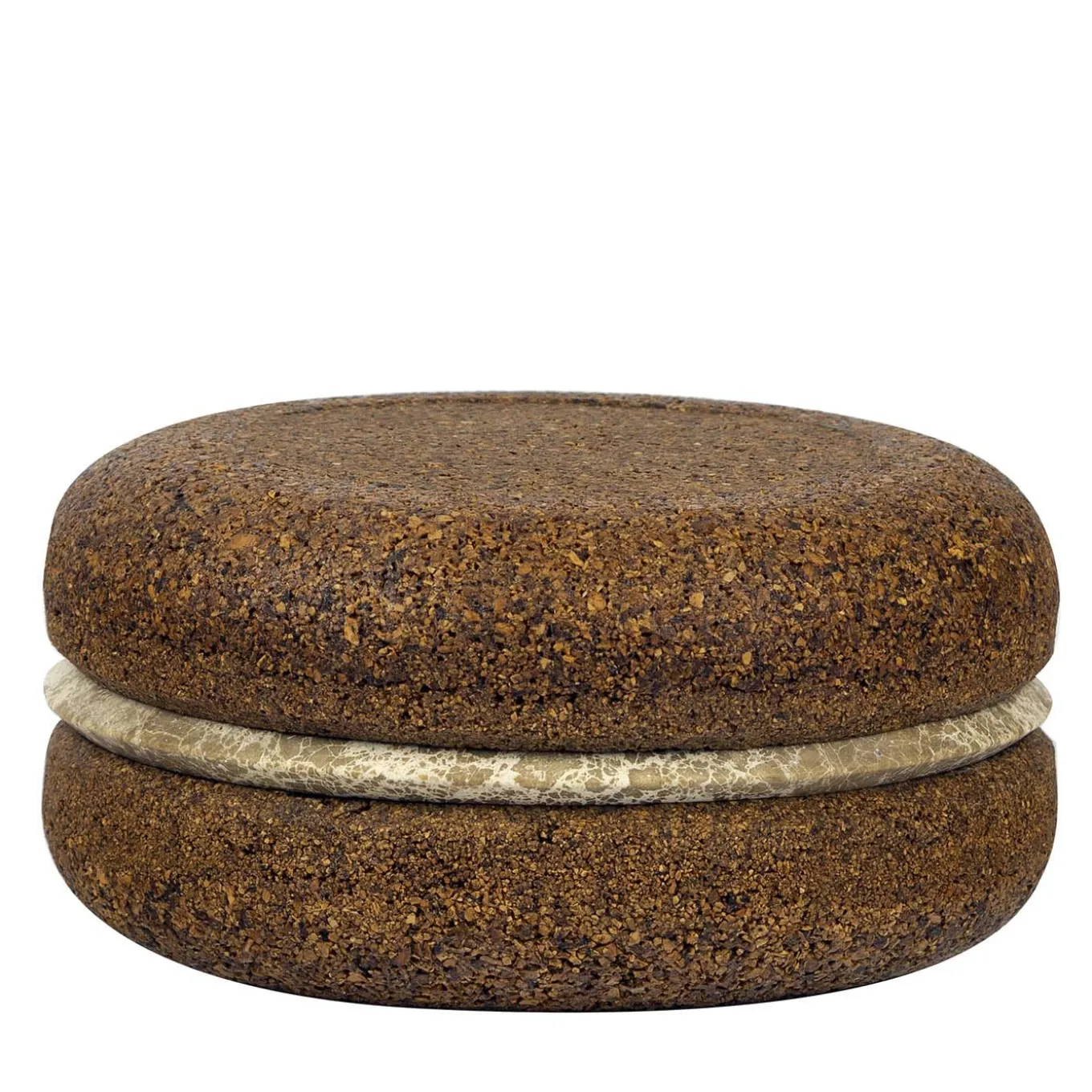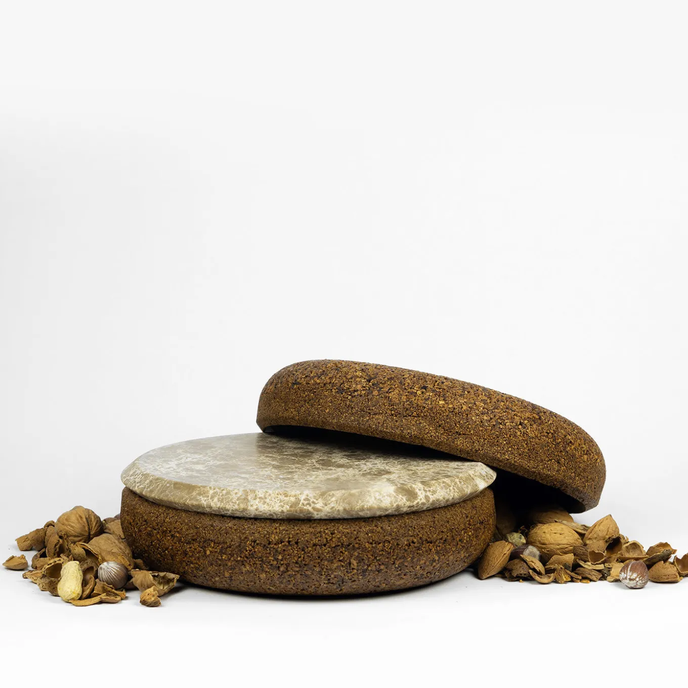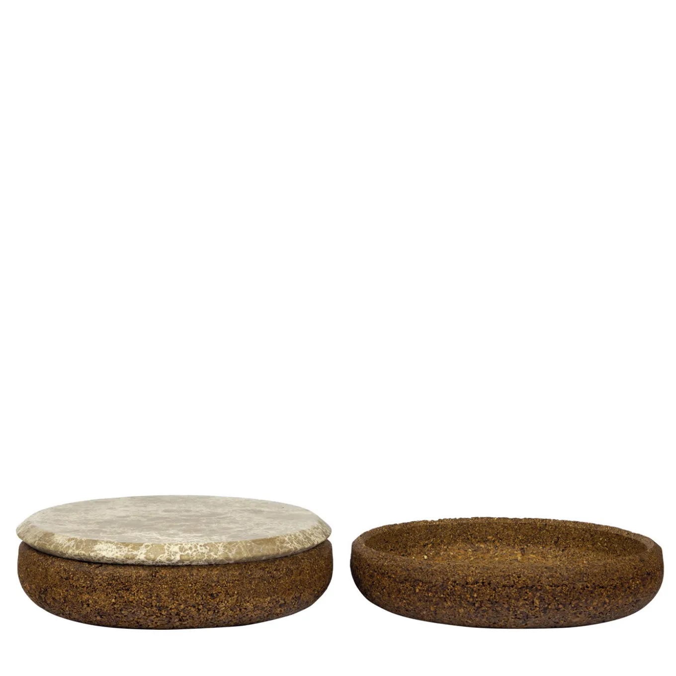 Three storage elements made of precious Emperador Light marble and Keep Life; a new composite material that’s ecological and malleable, generated from the shells of hazelnuts, chestnuts, walnuts, almonds, pistachios and peanuts etc, with a binder free from solvents and formaldehyde. The marble discs are machine turned and finished by hand for a smooth finish.