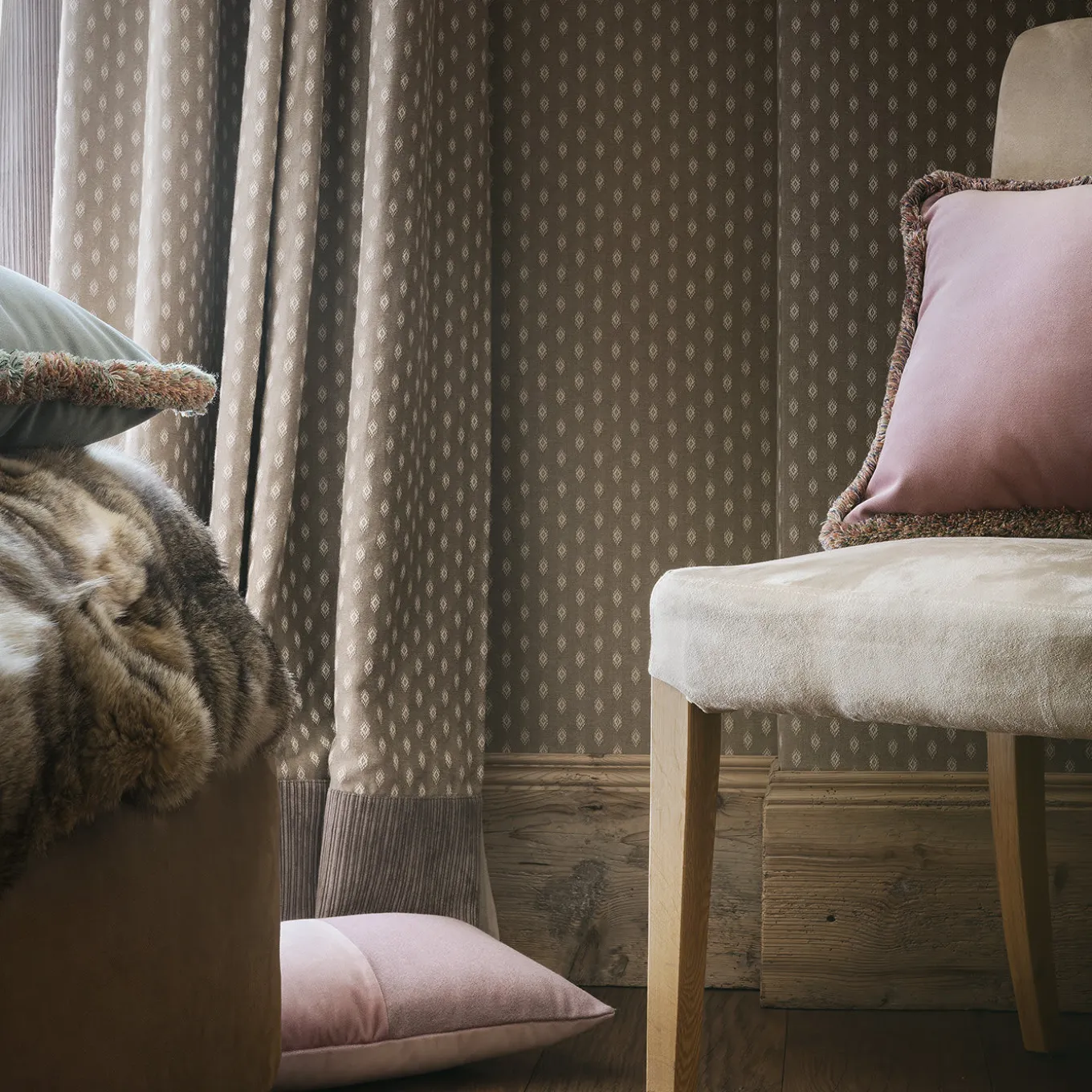 The stylish antiqued pink hue of the soft velvet fabric upholstery (removable) makes this plush cushion the perfect, romantic accent in any living room or bedroom. Outlining the square shape padded with polyester fiber, the bold trimming in prismatic hues add aesthetic value and a couture flair to the piece.