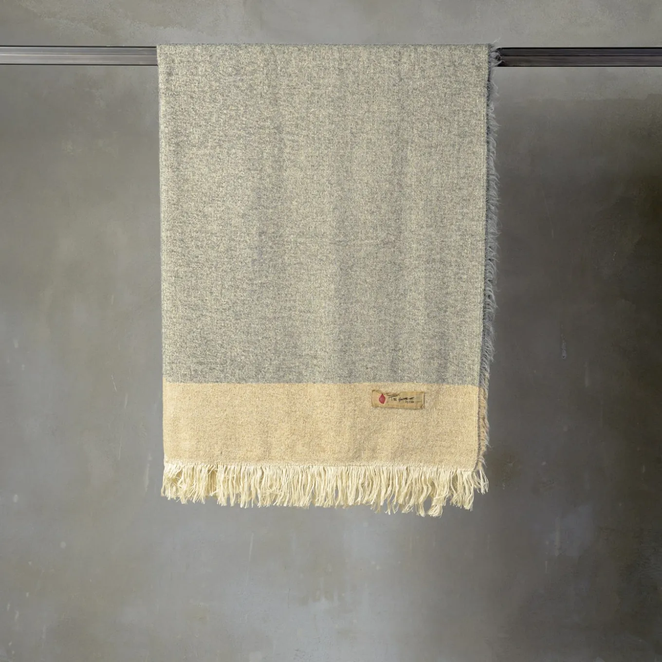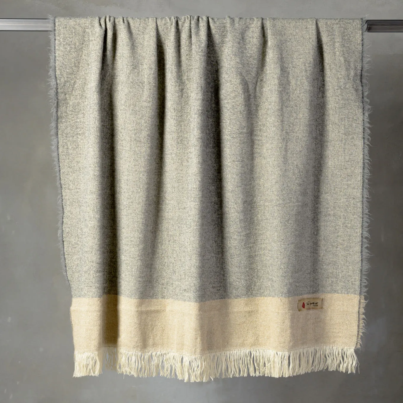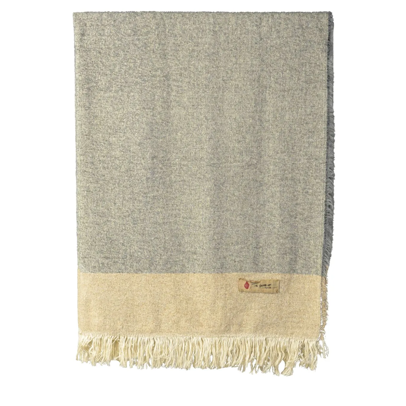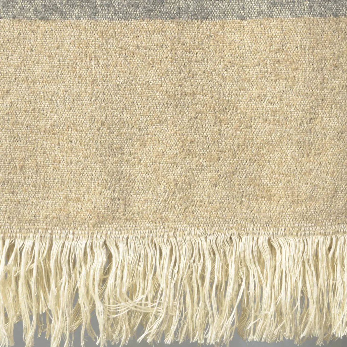 Fine linen and wool with exclusive alpaca wool fibers comprise this masterfully woven blanket, a design brimming with restrained elegance and comfort. The delicacy of its light-gray and beige tones impeccably harmonizes with the simplicity of its linear detailing, accentuated only by the fringed borders.