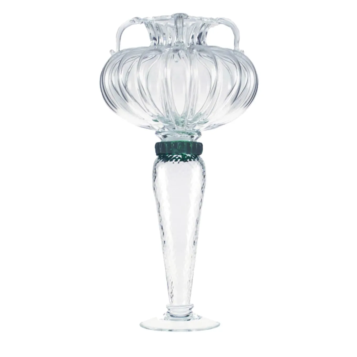 Impeccable artisan mastery and sculptural flair merge in this exquisite vase. Designed by talented architect Borek Sipek, it sports a tapered silhouette accented with a green ring at the center, right below the bulging bowl, which flaunts an endlessly intriguing ribbed design. The vase’s striking transparency enhances its textural dynamism.