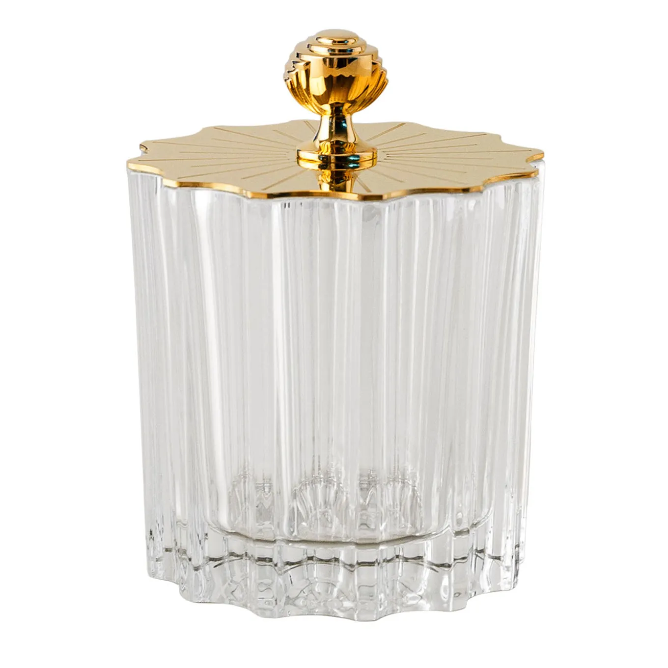A faceted cristal jar in classic Art Deco style, topped with goldplated lid adorned by a sculptural knob. Designed to hold cotton balls, keepsakes, or small trinkets, this piece combines timeless elegance with practicality, enhancing any vanity or dressing table setting.