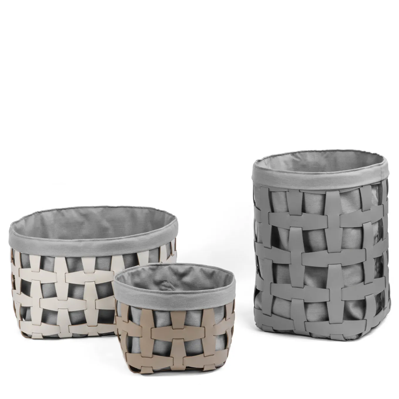 Combining a clean, modern look with the elegance of soft, supple leather, this laundry basket will be an eye-catching addition to any bedroom, bathroom, or vanity. The frame is fashioned of water-resistant tan-colored leather interwoven in a criss-cross pattern. This frame supports the inner gray laundry bag fixed to the leather with a hook. This basket is available in four sizes, while the frame and bag are available in classic colors or blue, taupe, ivory, fantasy and light blue, respectively. Please contact the Concierge for pricing and details.