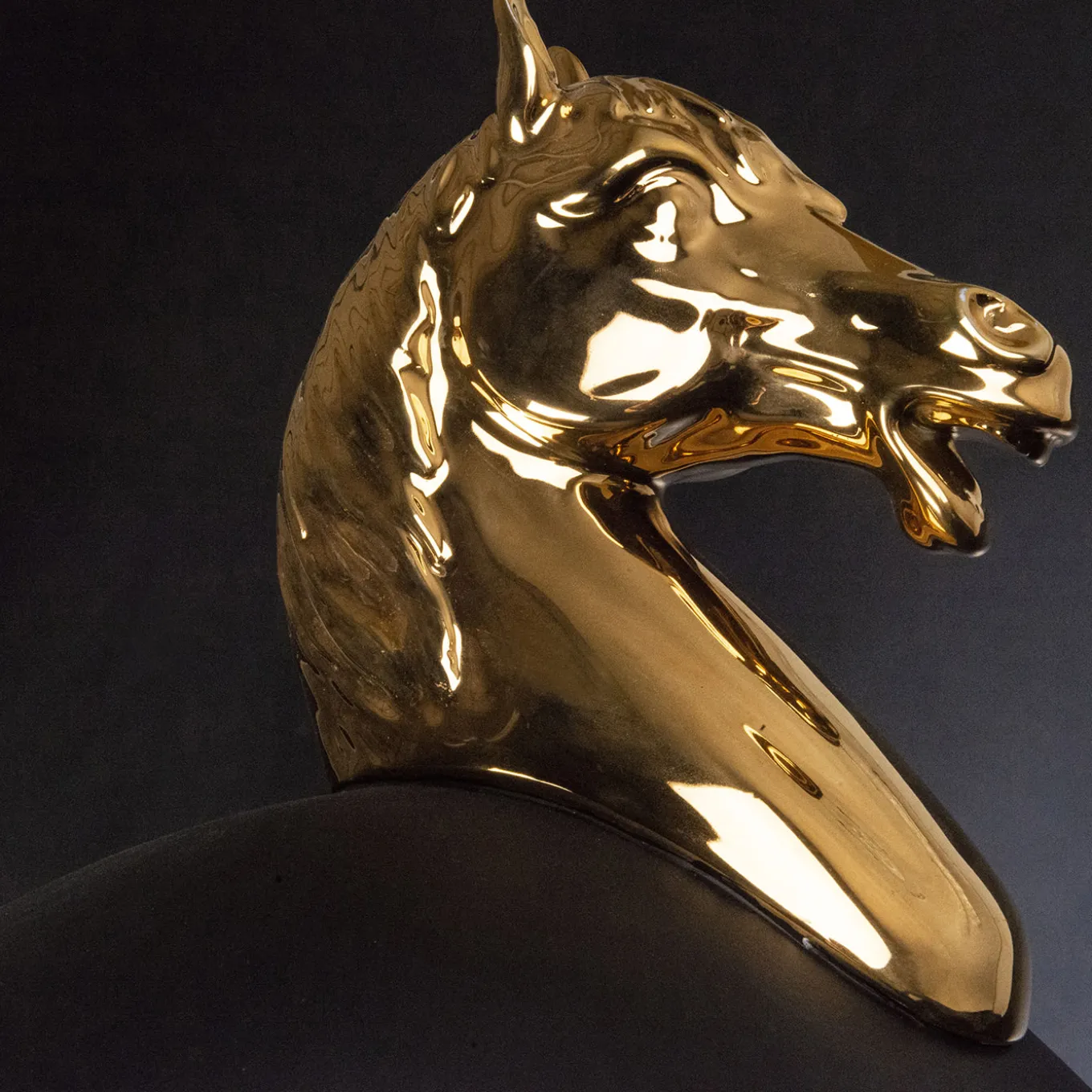 This exquisite artisan ceramic vase delivers its eclectic character through a clever combination of Baroque-style zoomorphic elements and a clean-lined, plain bulging body in an elegant matte black finish. Its opulent allure, revealed by the glossy-golden horse-shaped handles, makes it apt to infuse luxe banqueting or private contexts with an eccentric eclectic touch.