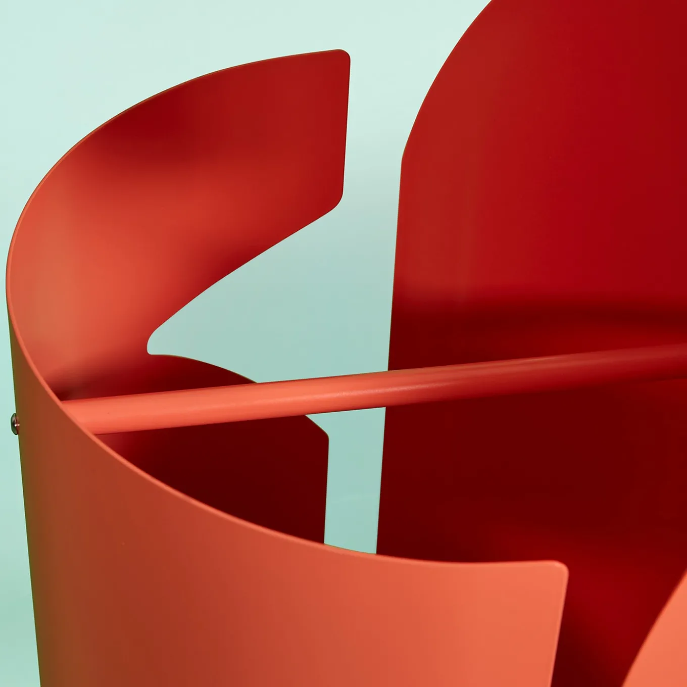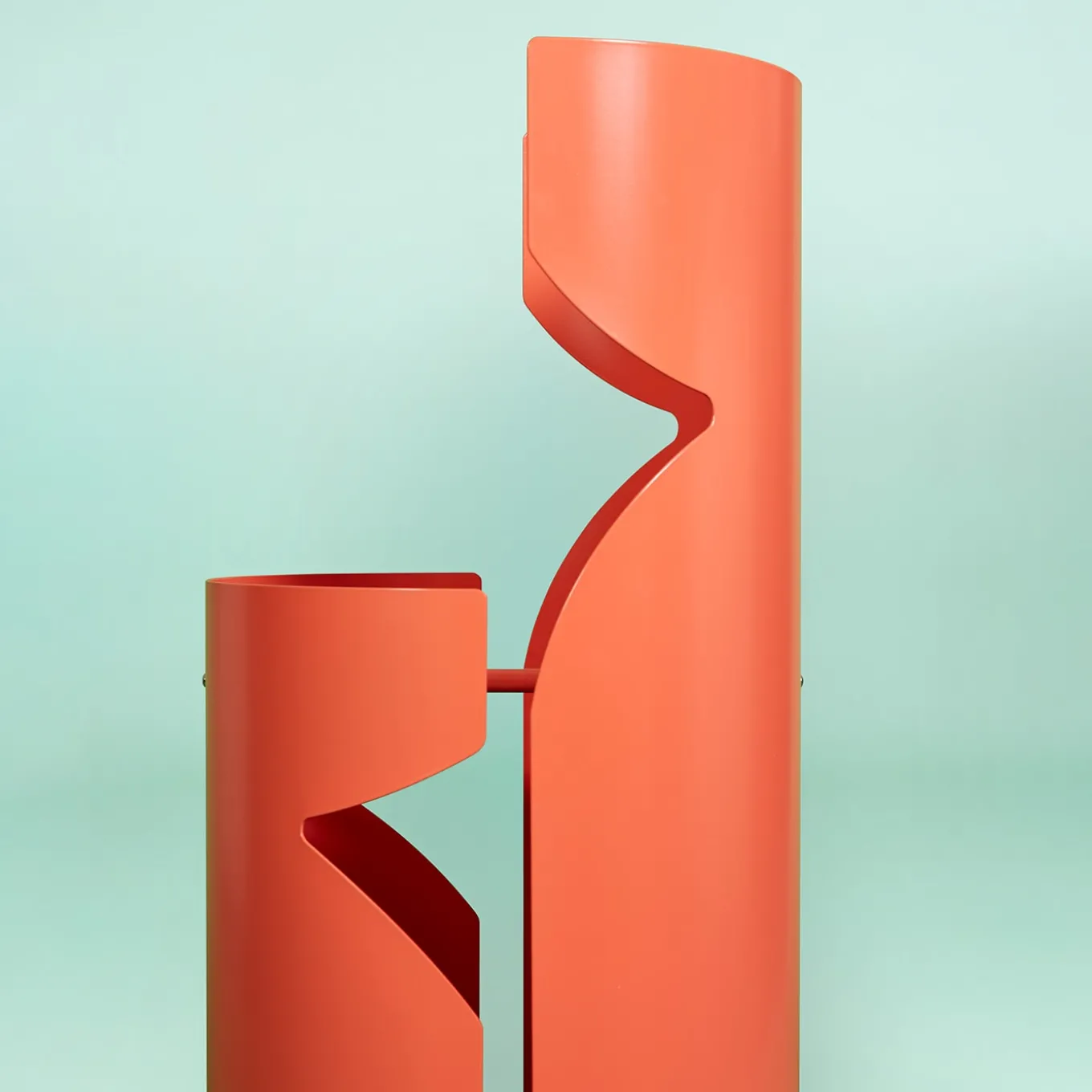 Hug Melon umbrella holder designed by MM Company features two curved metal sheets that embrace each other, forming a unique geometric silhouette. Its sleek and refined design adds a distinctive touch to home spaces while providing practical umbrella storage. The vibrant orange finish enhances visual appeal, making it a stylish yet functional accessory for entryways or corridors. Other color options are available in the Artemest catalog.