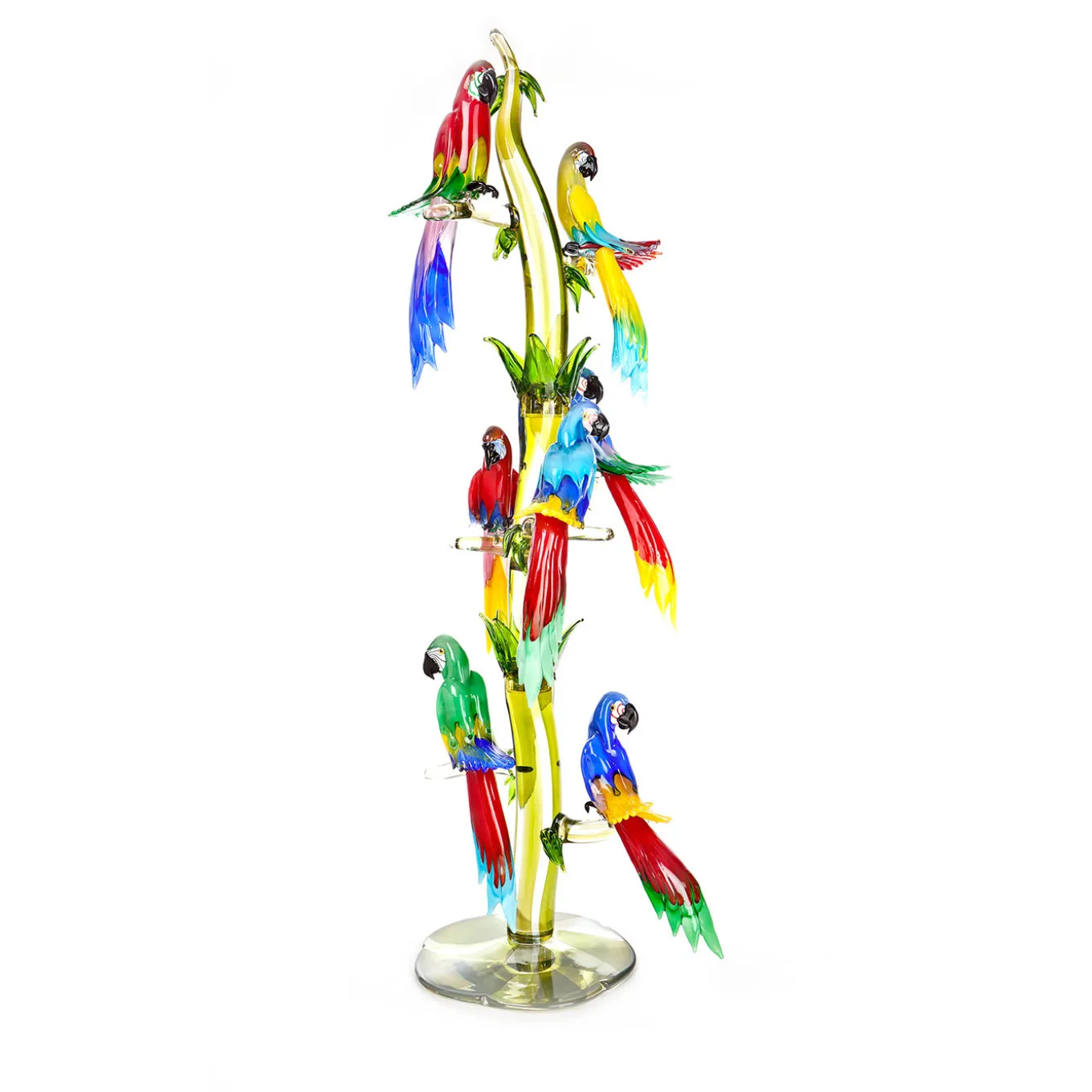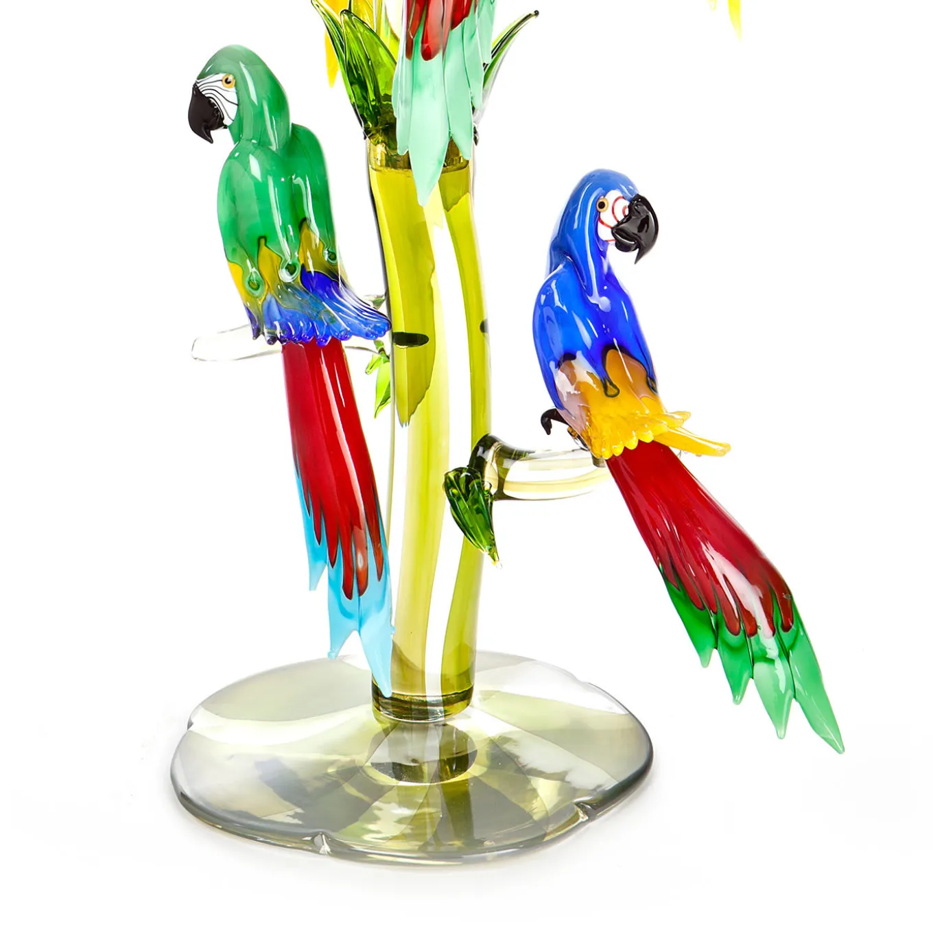 This showstopper 80-inch-tall glass tree with seven Macaw Parrots is handmade by the master glass blower Zanetti on the island of Murano in Venice. Remarkably animated and colorful, these birds are made of solid glass and perch on a clear glass branch pedestal with green details in the leaves. The birds have small built-in rods that rest easily in a metal seat on the pedestal and the tree is in 3 sections for easy assembly.