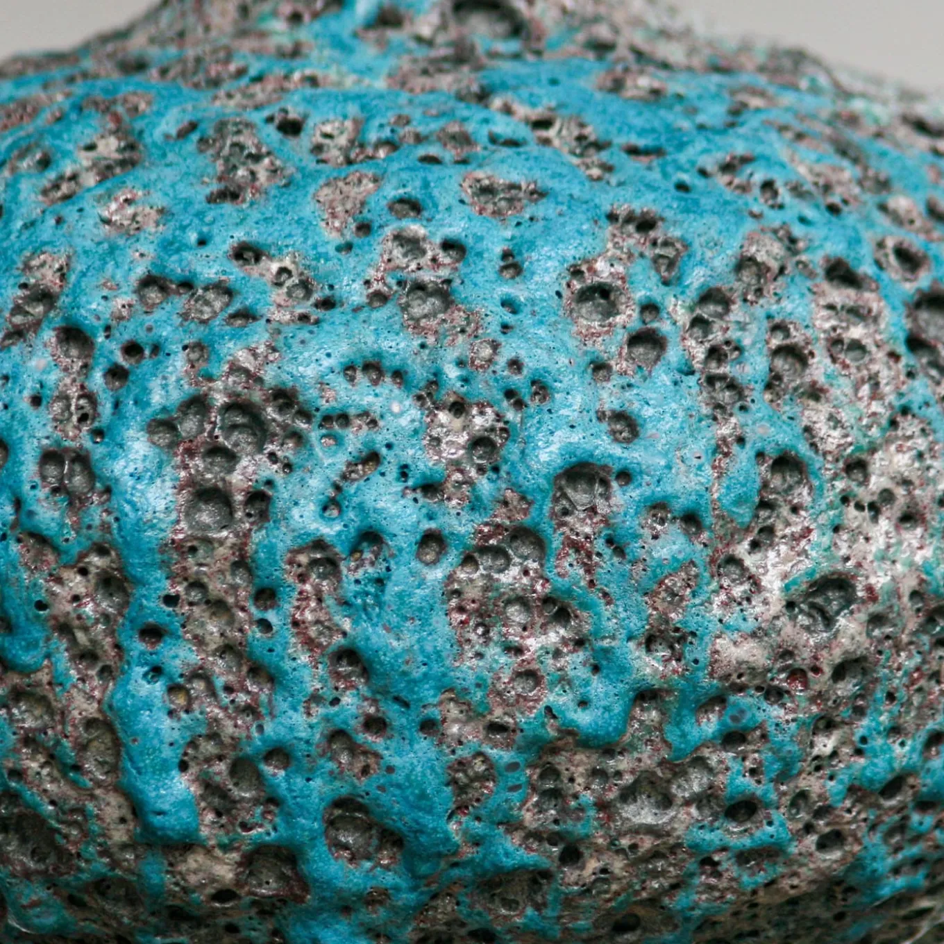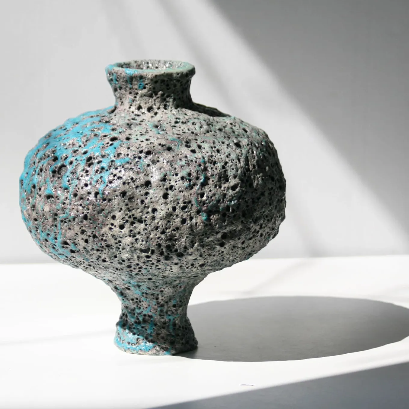 This handcrafted stoneware vase reimagines the classic shape of ancient water vessels. Made with the coiling technique, it features a unique volcanic glaze that creates textured craters, ridges, and hollows, enhanced by a dramatic blue glaze cascade on one side. The irregular surface plays beautifully with light and shadow. Entirely handmade, each piece is one of a kind, with slight variations in size and shape that celebrate artisanal craftsmanship.