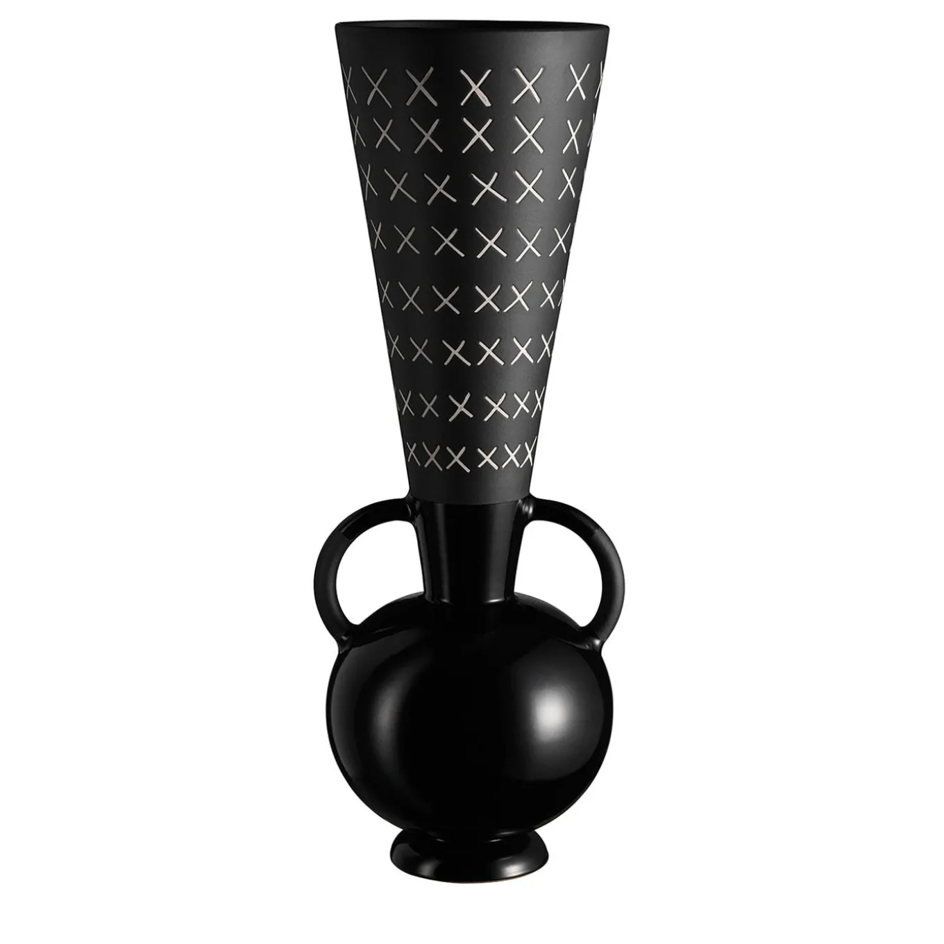 Conical and spheroidal vases play with lines and crosses in a black-and-white ritual: large clay vase, hand thrown, with clay handles. Finish in a glossy black glaze for the base and handles, matte black glaze and decoration with white engobe cross for the upper part. Designed by Ugo La Pietra