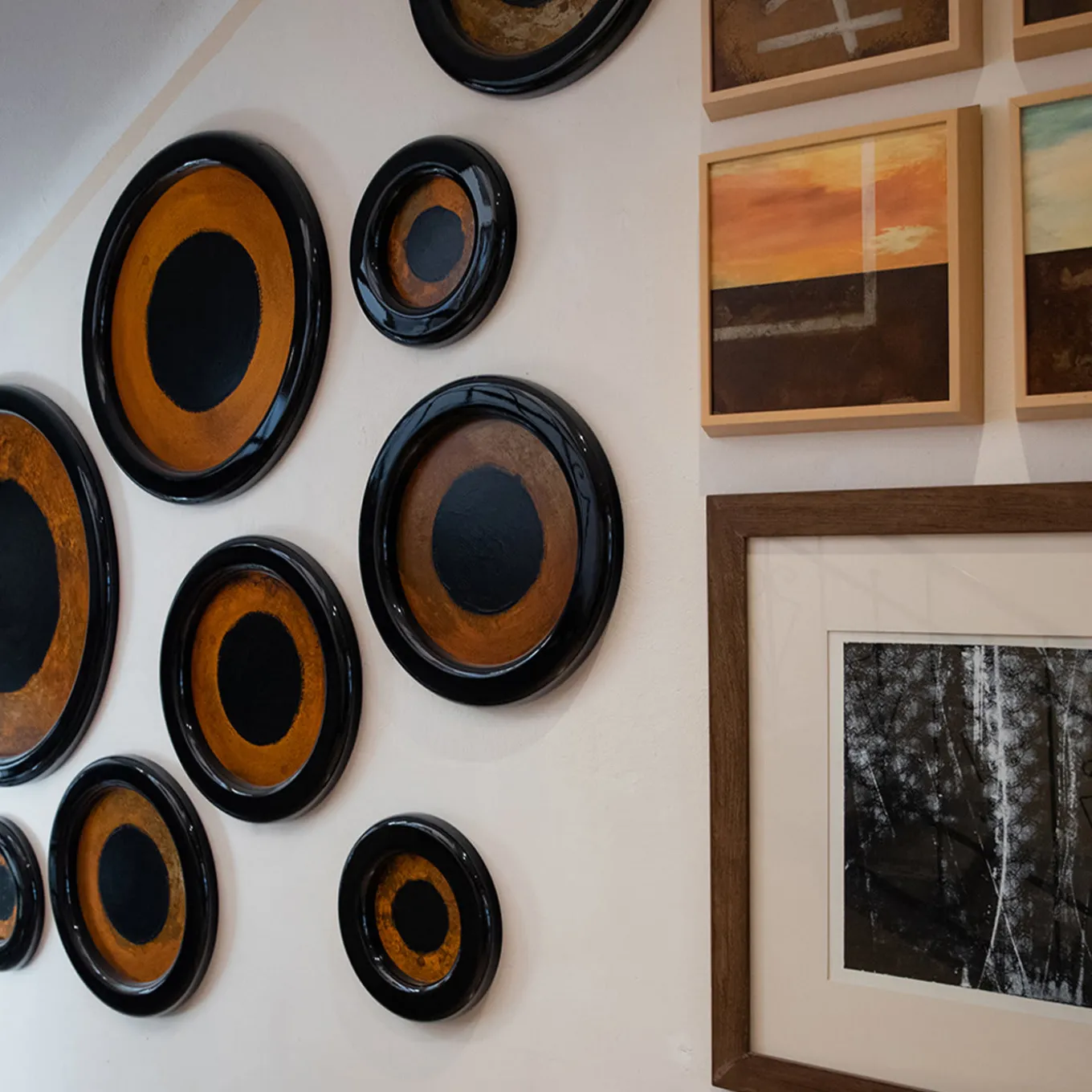 An original modular work, the Hypnosis is available in 4 sizes designed to decorate large or small environments. The central eye is an oxidized iron plate where the unique oxidation process makes the iron bright orange, providing stupendous contrast and ensuring that each element is different from any other. The stylish surrounding frame is crafted from wood.