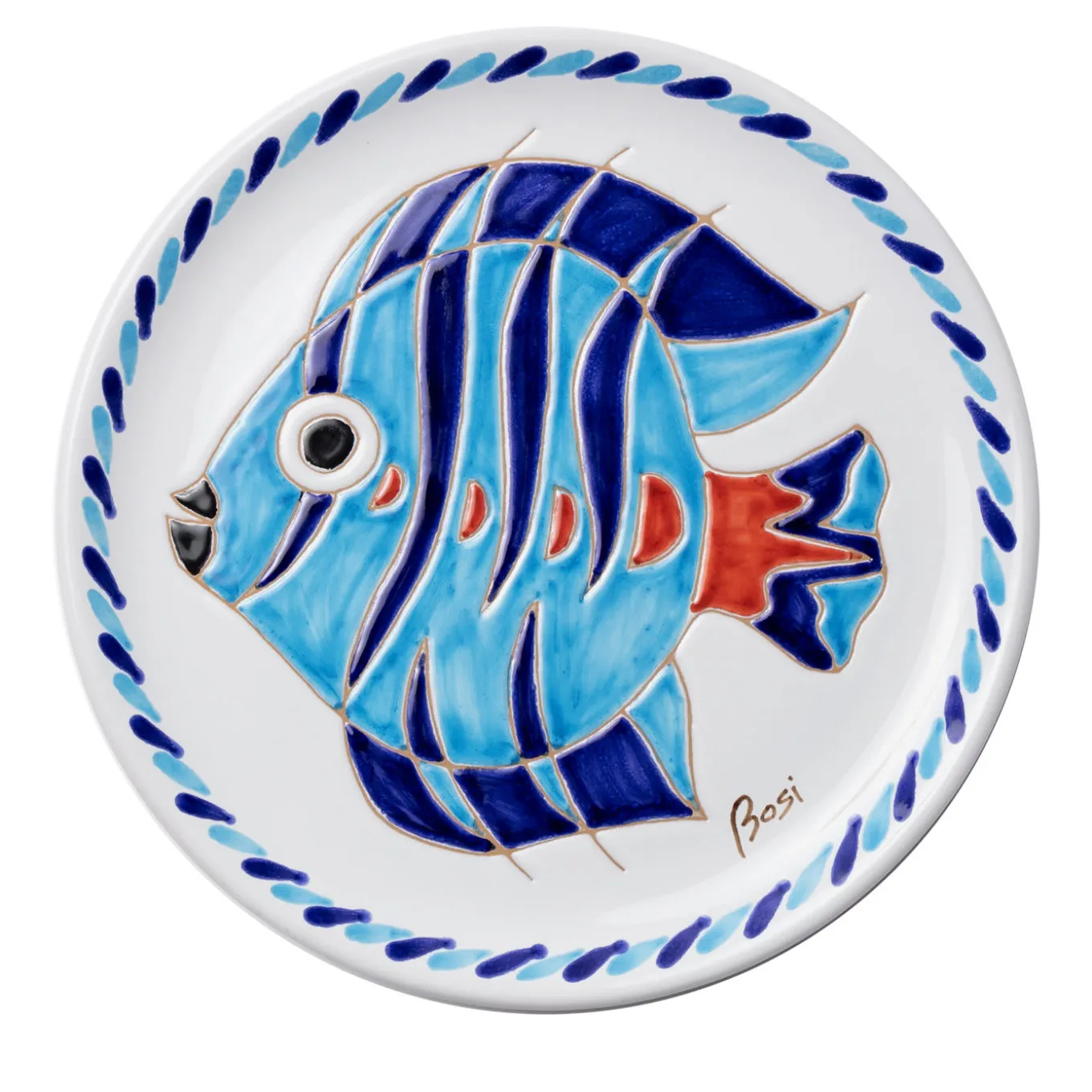 Part of a unique series of ceramic plates designed by Giorgio Bosi, this piece will make an elegant statement in a rustic or contemporary decor. Masterfully handcrafted, it features a vividly colored stylized fish depicted with the traditional graffito technique that incorporates enamels on the terracotta surface, creating a one-of-a-kind piece of refined flair.