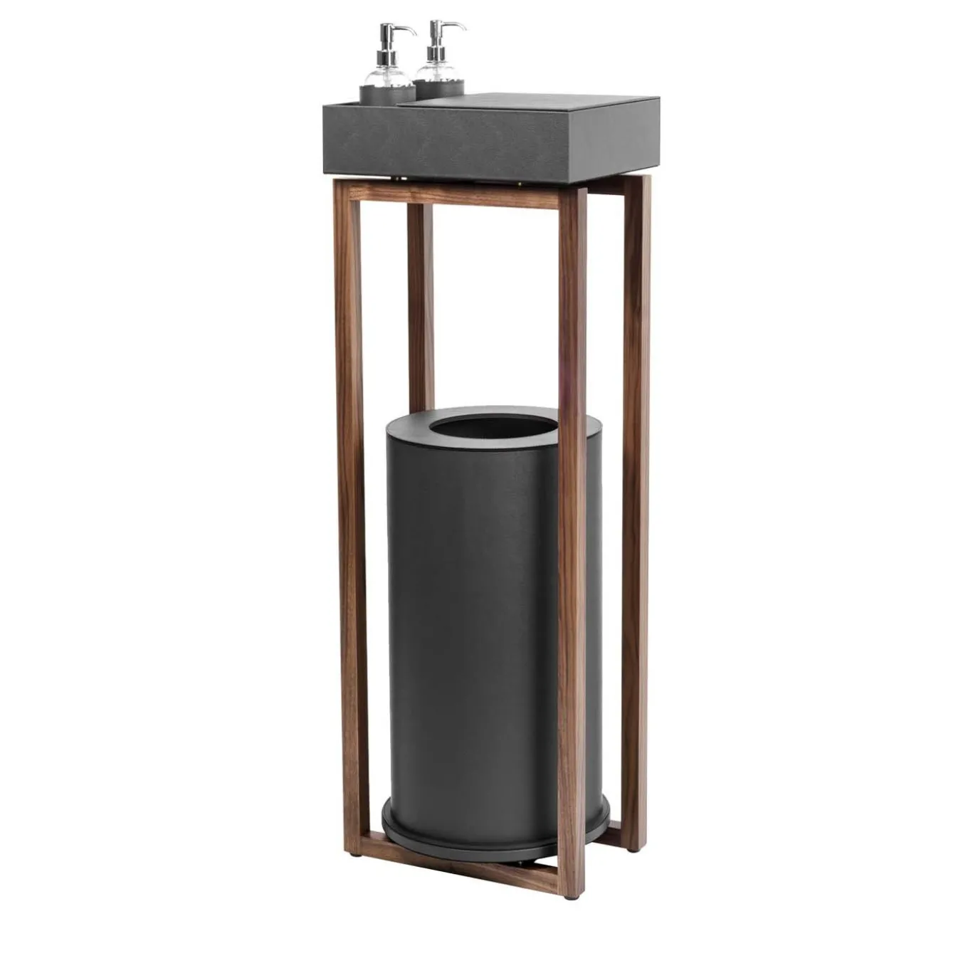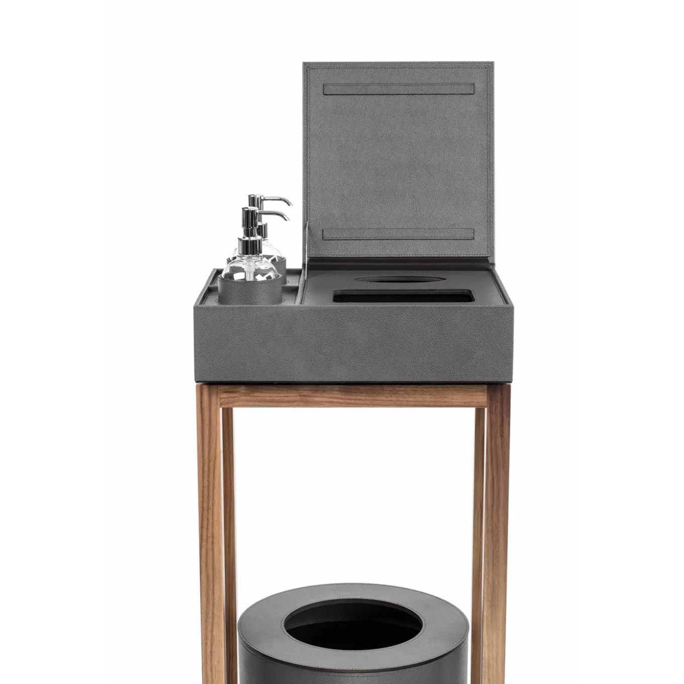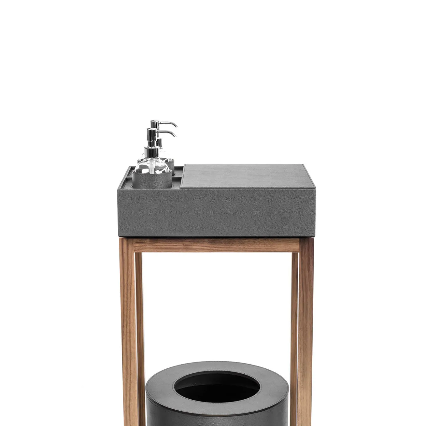 Part of the 2021 Igea Collection of sanitizing solutions for hotels, offices, and stores, this refined station will add instant elegance while providing a clean and germ-free environment in high-traffic areas. Enclosed in an open Canaletto walnut wood free-standing base, the large cylindrical bin underneath and the boxy tray with two refillable gel sanitizer dispensers are wrapped in gray regenerated leather. The top lifts up to reveal two compartments for disposable gloves and face masks.