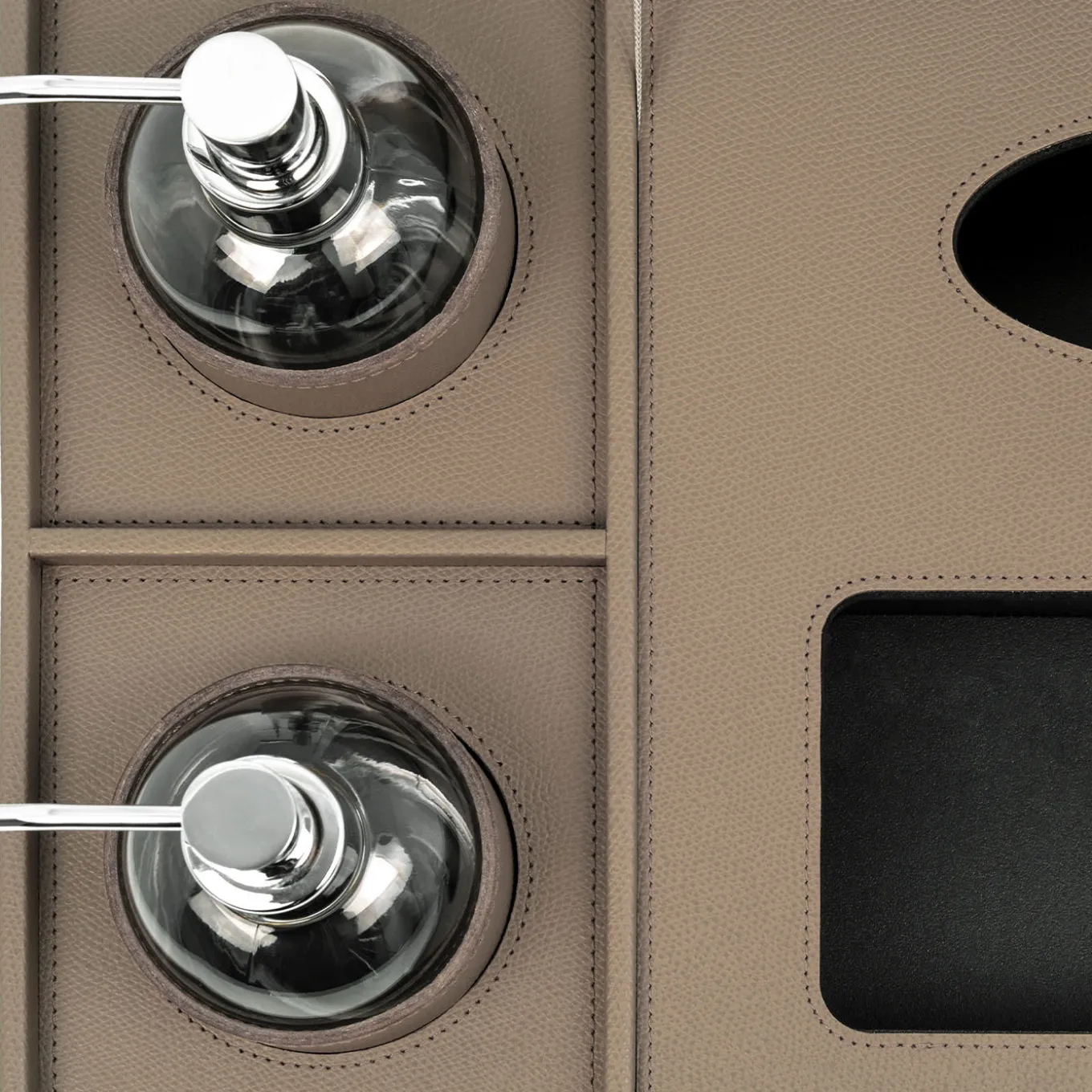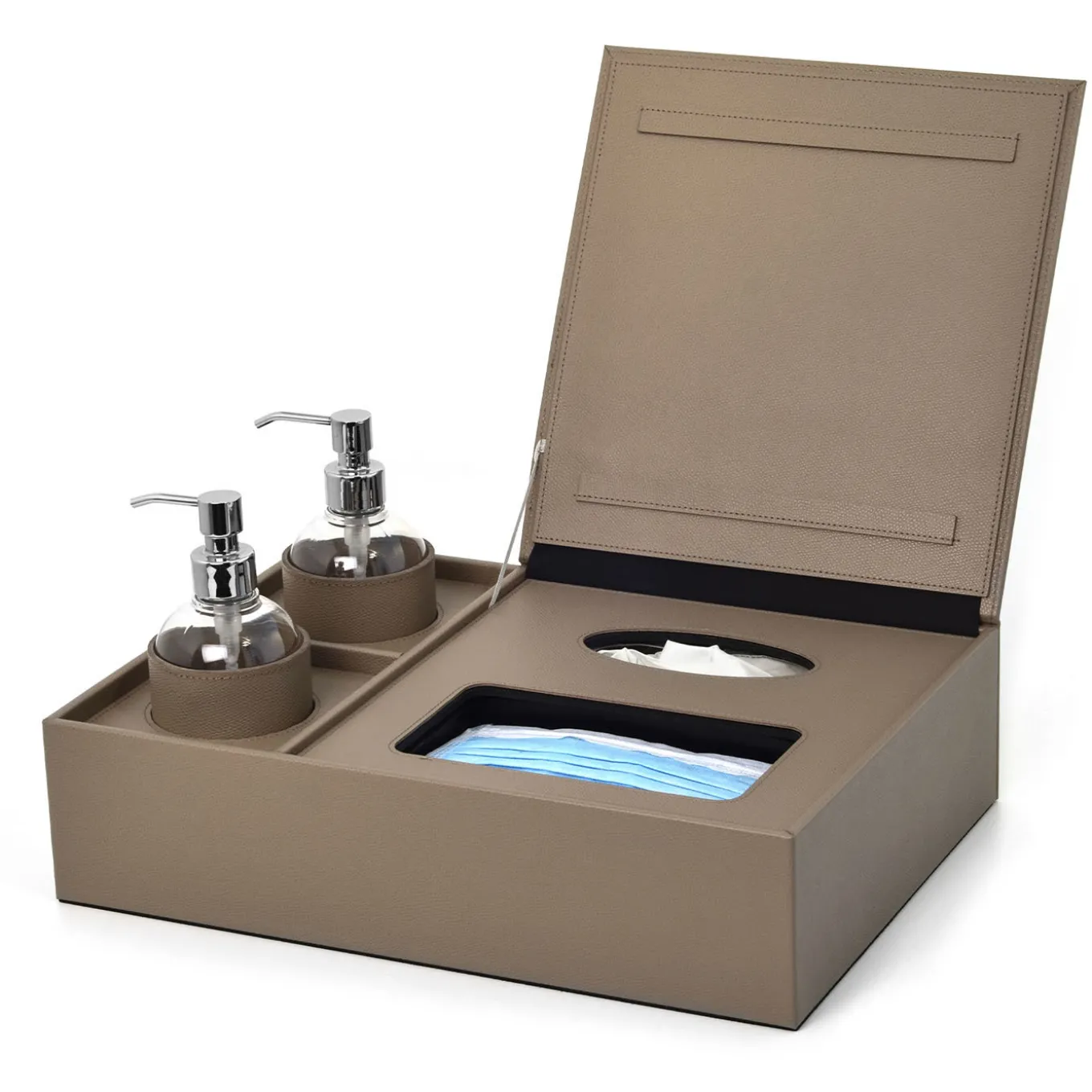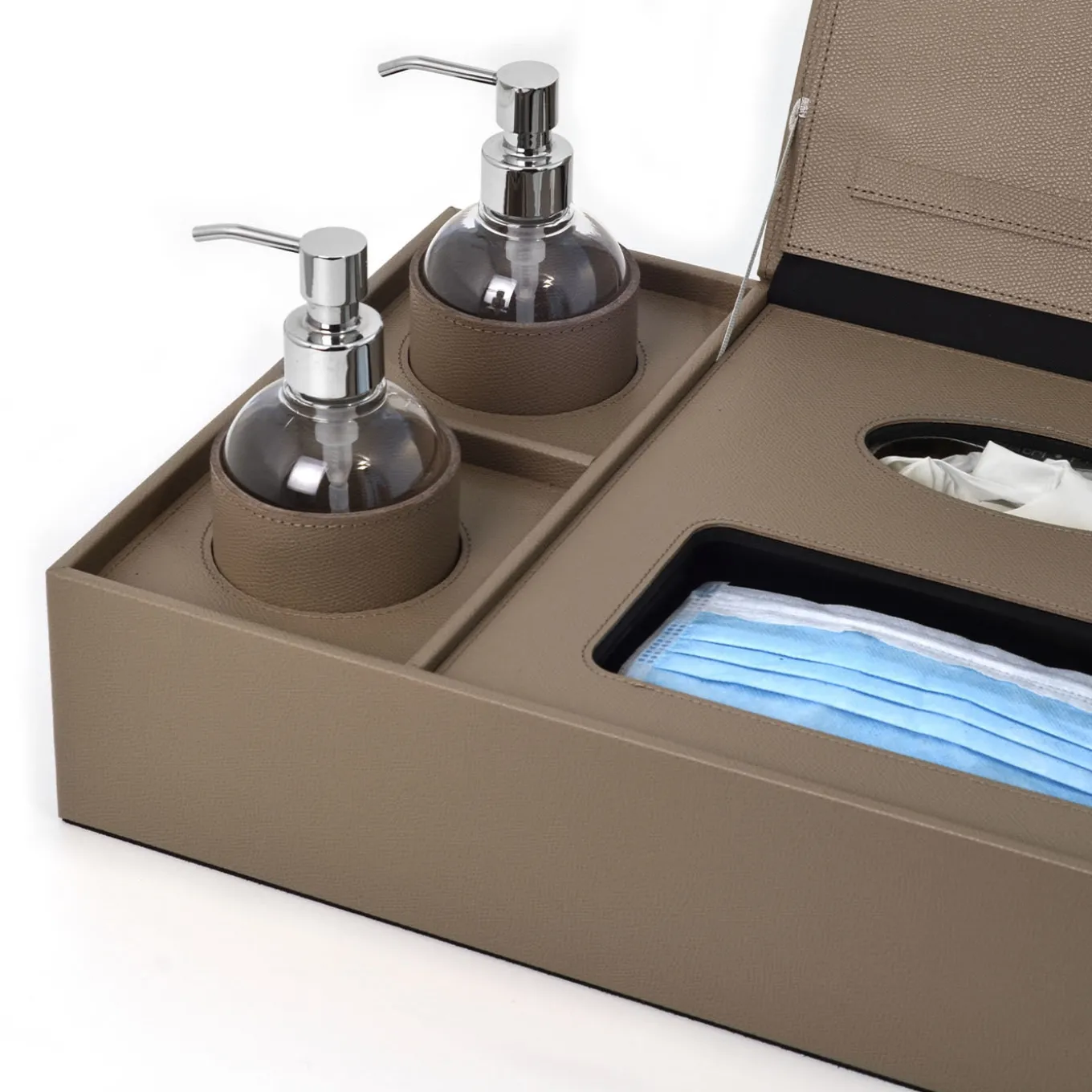 Dressed in soft Italian leather, this elegant tray is a stylish solution for both commercial and residential interiors designed to provide your guests or customers with hand disinfection and accessories to maintain the environments clean and sanitized. Shown in a versatile taupe hue, and available in a wide range of colors from the Malaga catalog, this set includes two refillable glass bottles for hand sanitizer and two storage compartments for disposable gloves and masks under the hinged lid.
