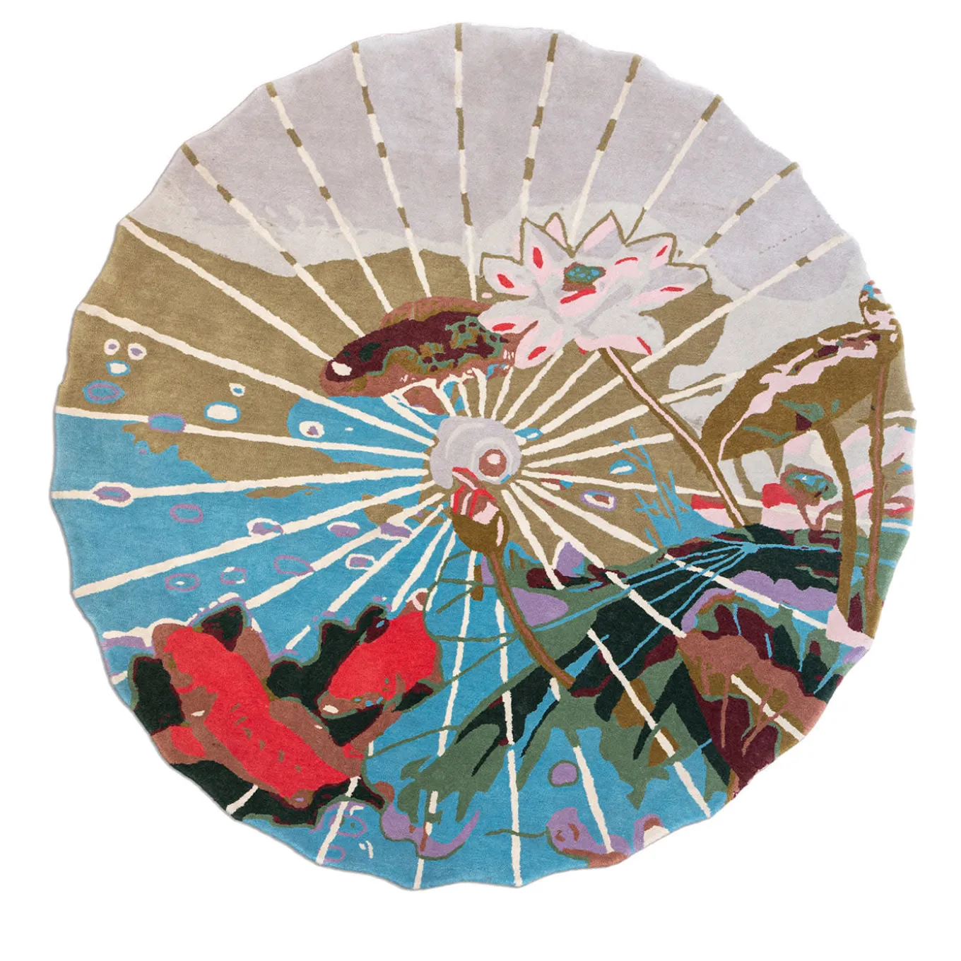 IKE e KOI, in the Japanese language respectively “pond” and “carp” are two pure wool carpets in the shape of old Chinese paper umbrellas made in India by the best artisans. This romantic and iconic object, which in the oniric world represents adaptiveness and luck, leads to a colorful and mysterious world. IKE’s dominant colors are the blue of the pond and the carp’s red. It is the curiosity of exploration, the entomologist’s enthusiasm, and the beauty of movement.