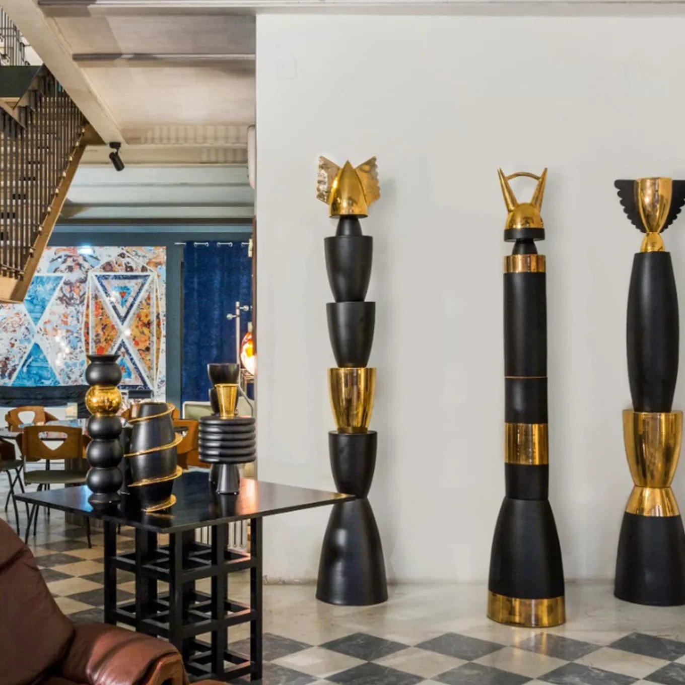 A ritual danced around a majestic and sophisticated idol, embodying the expressive power of a neo-pagan cult. This modern totem build a bridge between earth and sky with a new finish that exudes an innate mystical power. The totem is composed of 6 handcrafted clay pieces finished with matte black and gold glaze. In a limited edition of 9, this piece is a striking symbol of artistry and power. Designed by Ugo La Pietra.