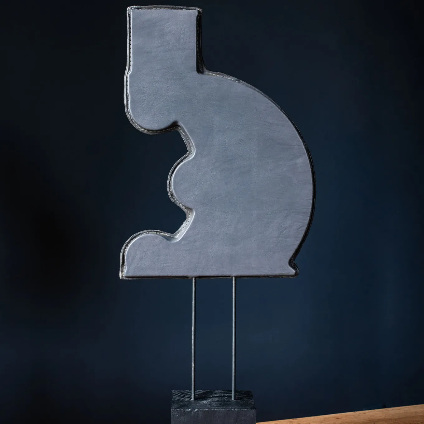 Il Monaco Gray Leather Sculpture embodies an artistic blend of form and function, crafted to enhance any interior space. This evocative piece features a sleek, gray leather surface artfully shaped into a unique silhouetted figure. Complemented by a sturdy black wooden cubic base, the sculpture provides a striking visual contrast and stability. Each piece is meticulously crafted and sewn, establishing a quiet yet impactful connection with its surroundings, perfect for those seeking to infuse a touch of sophistication into their décor. Ideal for display on shelves, side tables, or as a centerpiece, the sculpture’s presence invites contemplation and admiration.