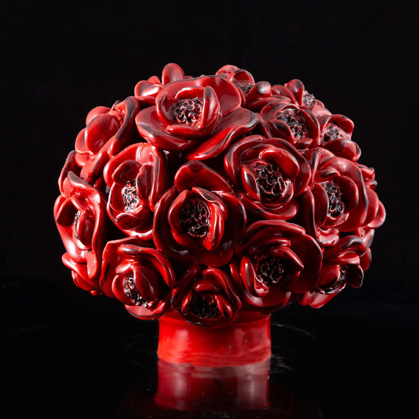 Marked by anthropomorphic traits immediately revealing its playful sculptural allure, this ceramic piece will be a precious ornament for the table. A bouquet of vibrant-red poppies gets sculpted from the lid, which lifts to reveal a practical a wide storage compartment. Multiple variants can be explored in the Artemest catalog.