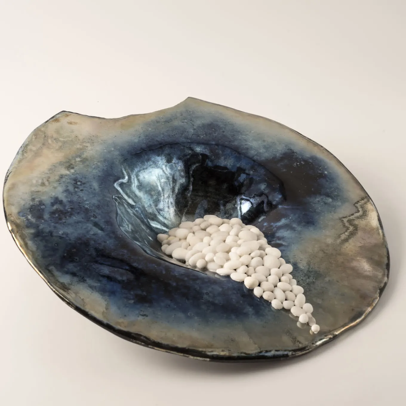 Eloquently named after the Italian for nocturnal enchantment, this piece is a singular ceramic artwork ideally sitting in the center of refined contemporary tables. Dappled blue fading into golden tones describe its glazed look, only interrupted by the cascade of white pebbles deliberately distributed on the verge of slipping out. Minutely handcrafted according to the ancient Japanese “Raku” technique, the piece is truly unique.