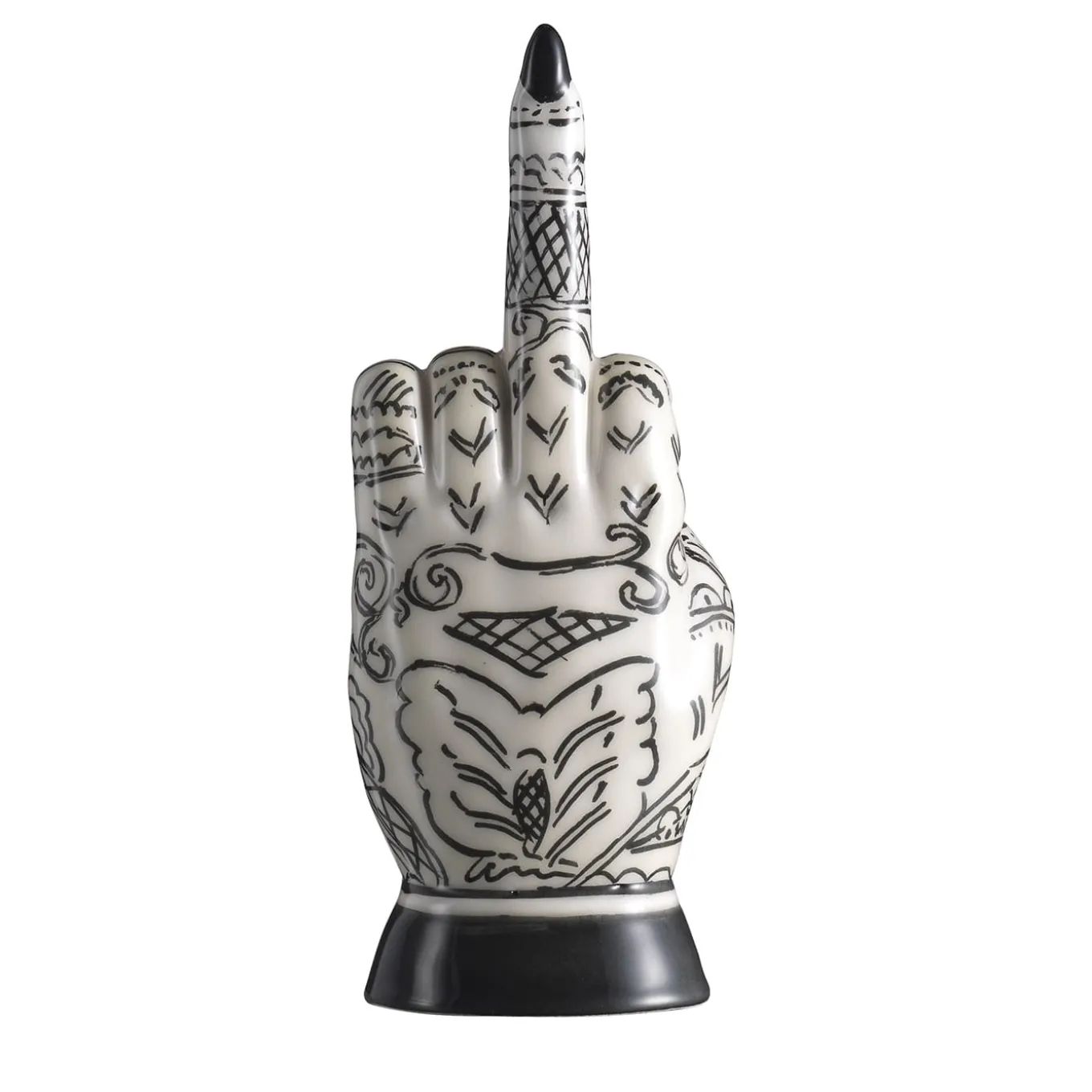 A dance to a tribal rhythm, following magical geometries and architectures in which energies and souls merge. Hand-cast white clay hand, with hand-painted black decoration and transparent glaze finish. Designed by Ugo La Pietra