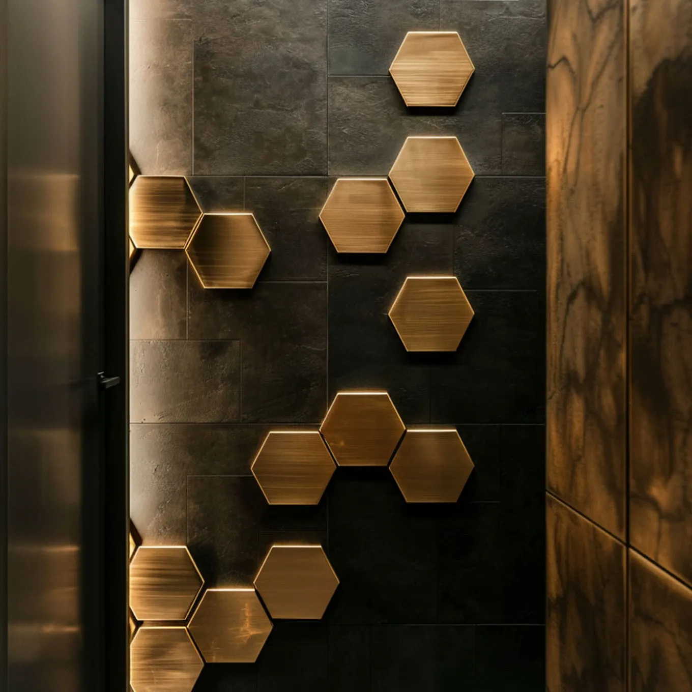 Equally enchanting on the walls of refined homes or restaurants, this set of 20 hexagonal brass tiles delivers an inebriating sense of opulence and warmth. Its contemporary elegance is elevated by the airy, almost brushed effect that counterbalances the set’s otherwise rigorous honeycomb pattern. Characterized by a subtle sheen, it is also offered in a variety of finishing options that add to a copper variant. The price listed is for the set of 20 tiles. Product images show the different compositions that can be made. Contact the concierge for more information and details.