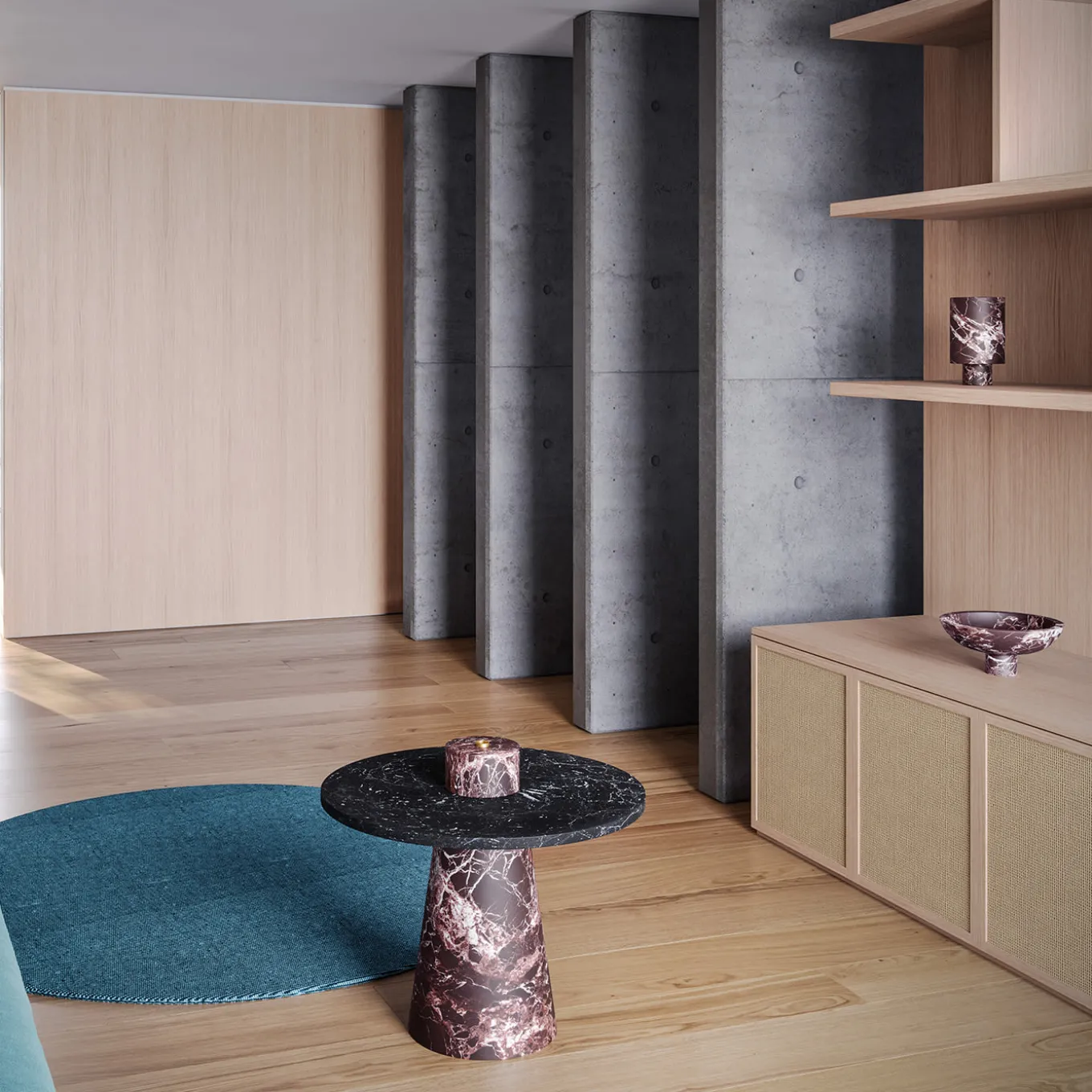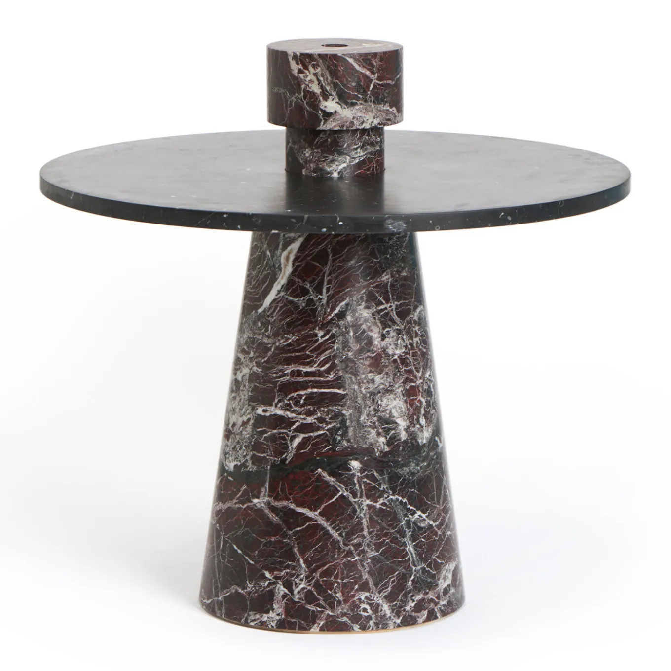 Exuding pure sculptural flair, this refined candleholder was conceived by Karen Chekerdjian as a complementary accessory for fitting into the tops of the tables from the Inside Out Collection. The minimalist yet evocative shape in red Levanto marble stands out for the eye-catching veining that extends throughout the two stacked, different-sized cylinders composing its geometric body. Any candle is sure to splendidly enhance the one-off characteristics of this unique candleholder. Please note that marbles and stones are natural materials and they can differ also if coming from the same quarry or the same block. The product shown may differ from purchased items. Every piece is unique.