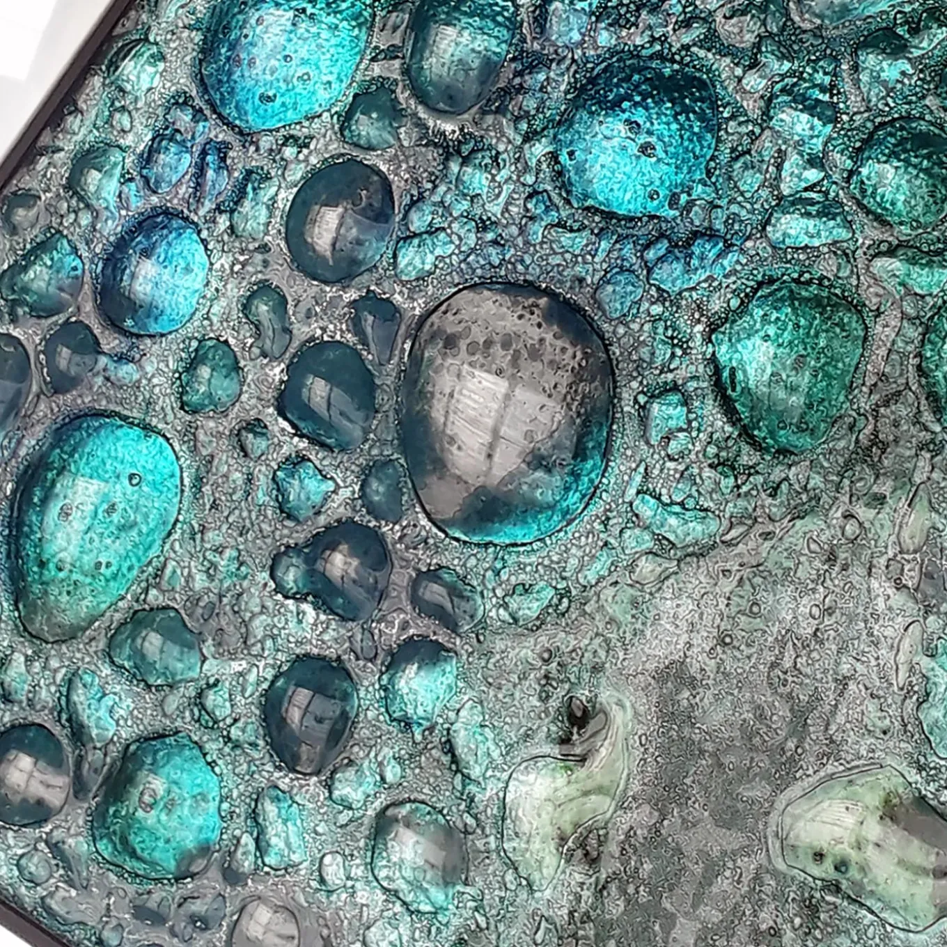 This mesmerizing round mirror trascends mere function to enhance its intrinsic artistic quality, obtained by incorporating blue glass inserts into its mirrored glass body, the former reminding of water’s bubbles and the latter evoking the clarity of water sources. Wood and steel complete the structure of this one-off design that is an hybrid between a mirror and true objet d’art.