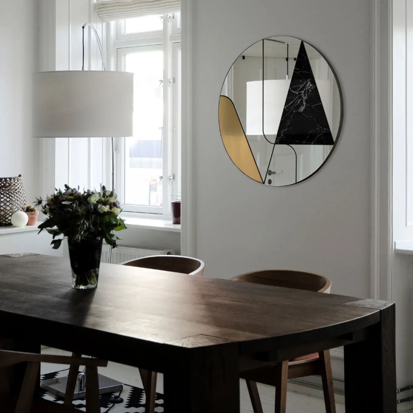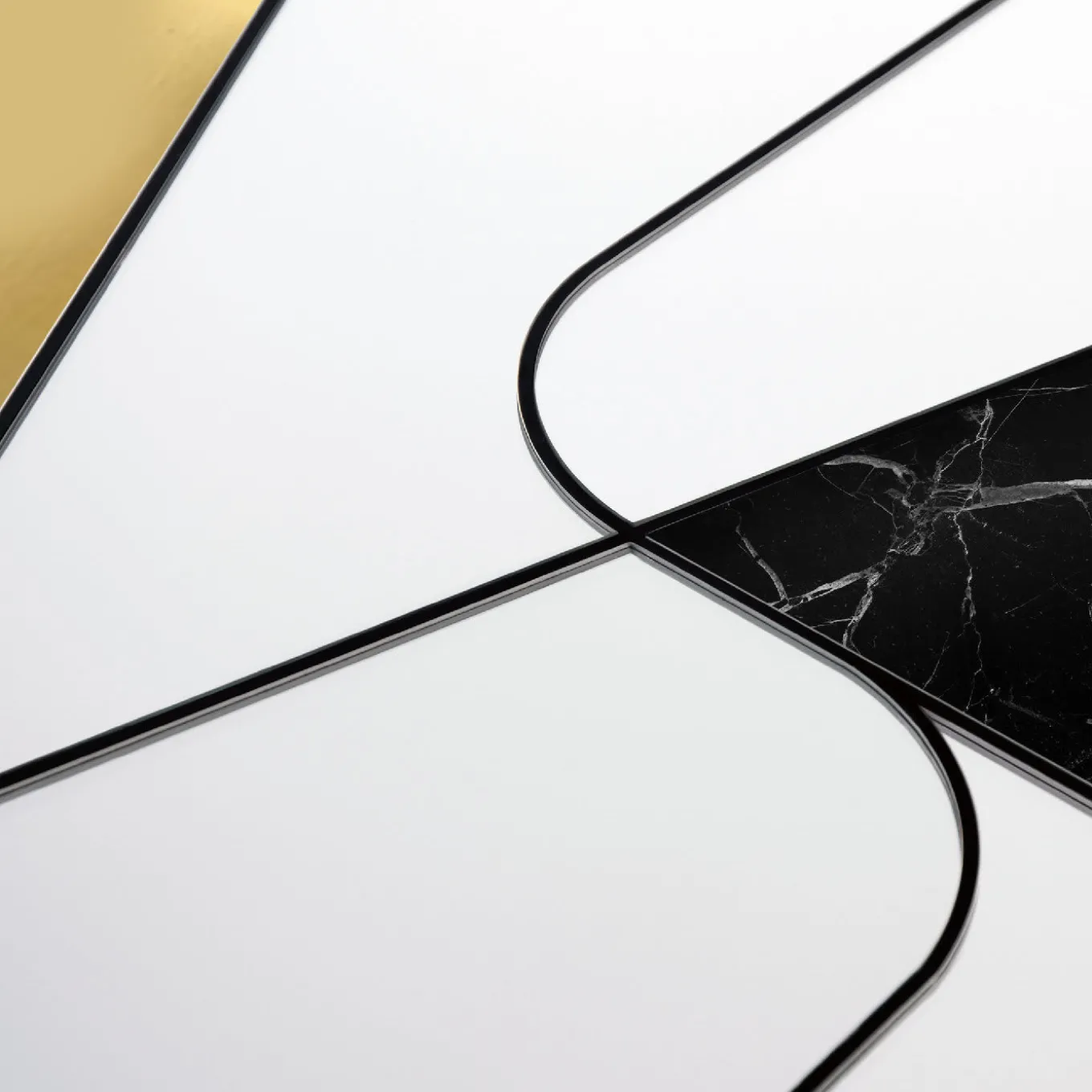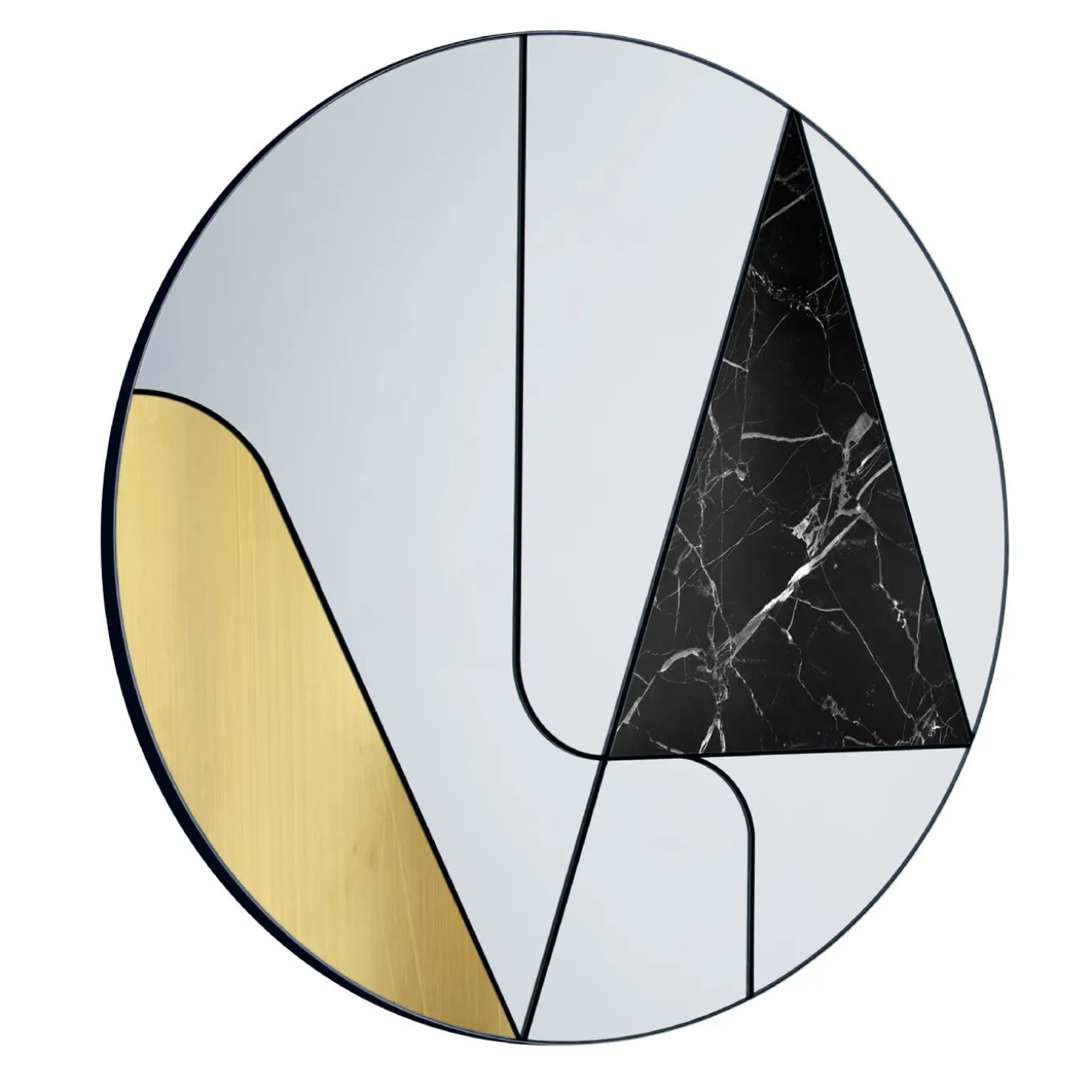 A series of lines cut the space within the round frame of this magnificent mirror, the asymmetric mirrored surfaces adorned with a curved insert in brushed brass and a triangular slab of black Marquina marble. This captivating design is entirely crafted by hand and will create striking reflections on a modern interior, adding a lively decoration with its contrasting colors and finishes. The piece is supported by a wooden base with a steel setting framing the various parts.